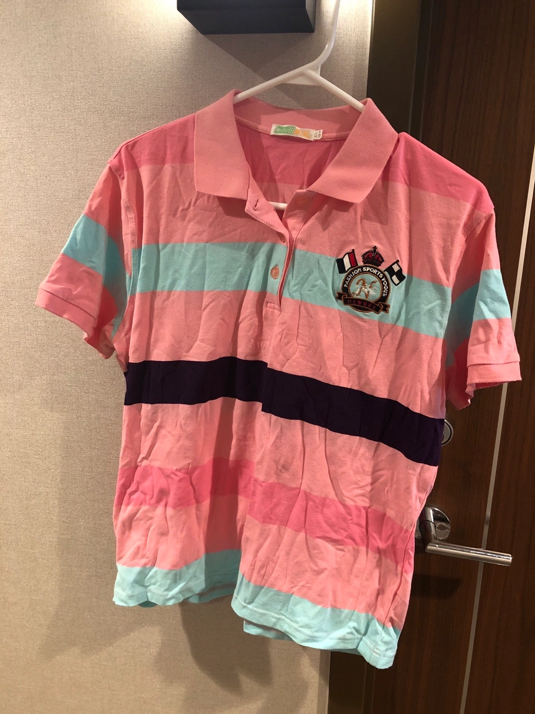 Selling a gently used polo shirt with a unique striped design! It features a mix of pink, light blue, and navy stripes. The shirt has a sporty emblem on the chest. It's in great condition and ready for a new home!