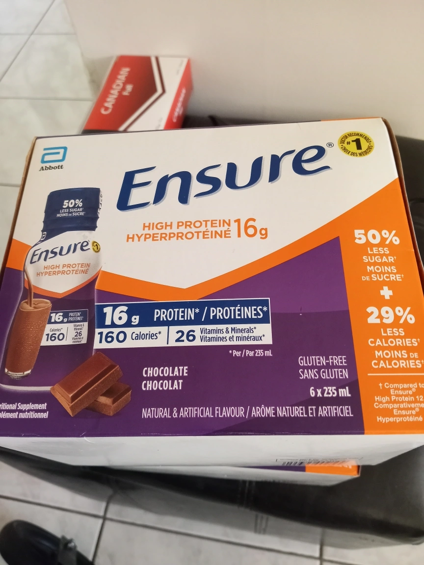 Selling a box of Ensure High Protein nutritional supplement! It comes in a pack of 6 x 235 mL bottles, with both chocolate and vanilla flavours included. It's gluten-free and provides 16g of protein per serving