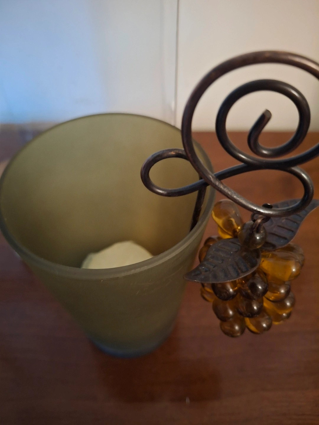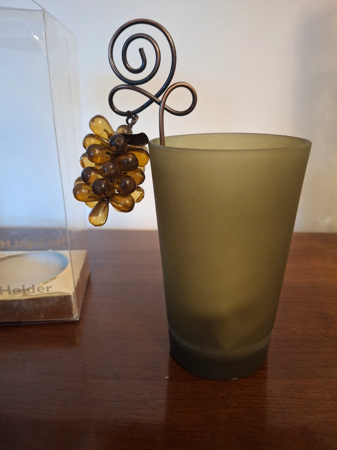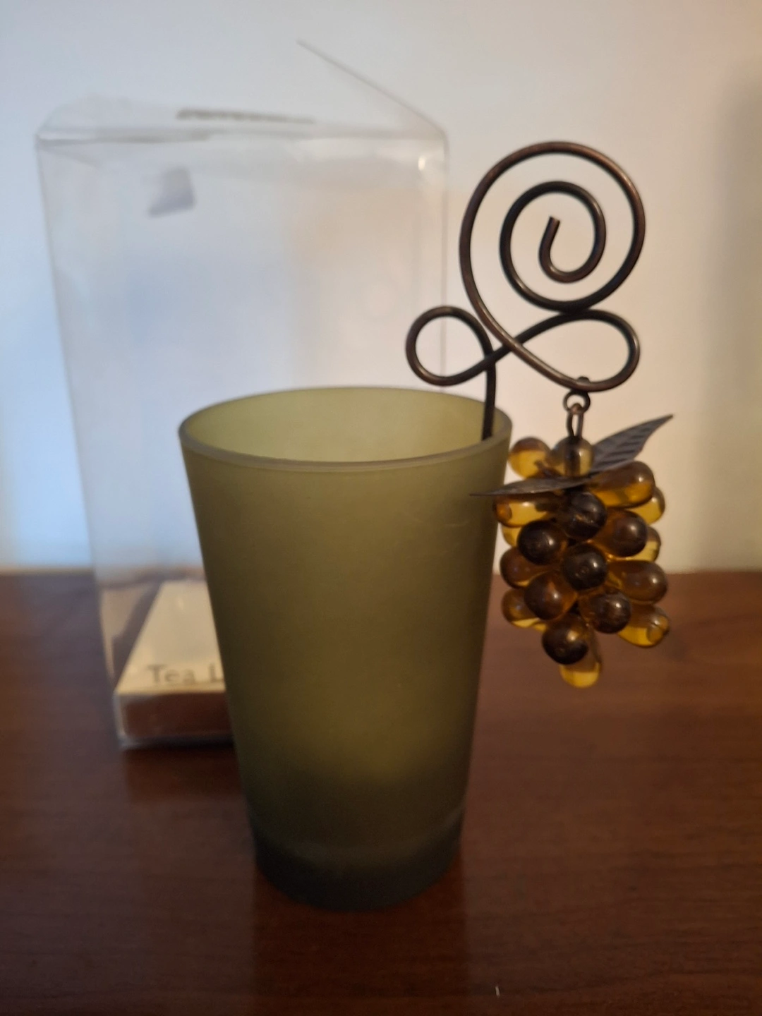 Green tea light holder (tea candle included). Hanging grapes on the side. 4.1/4”