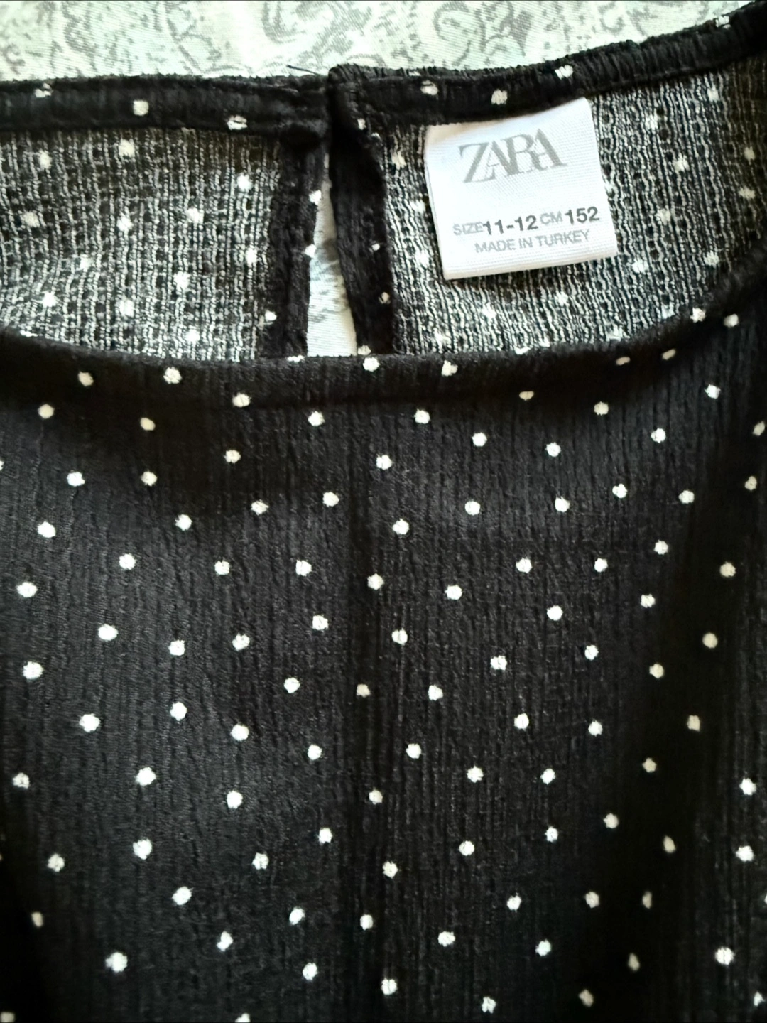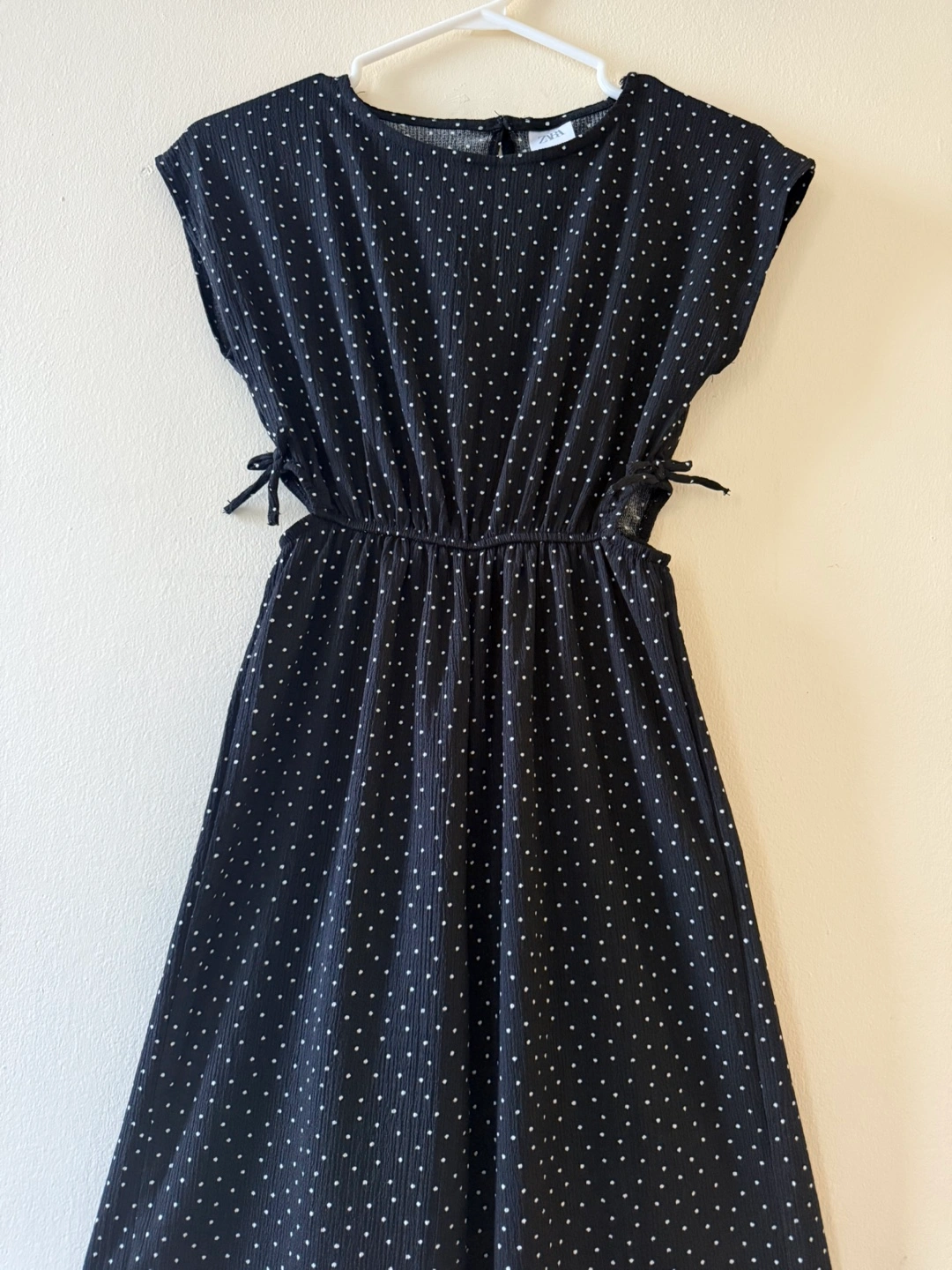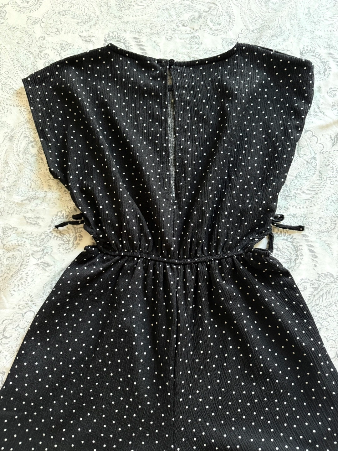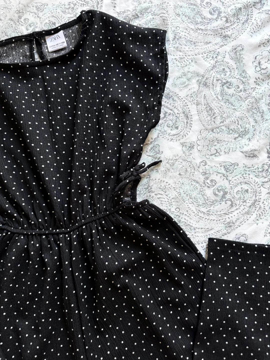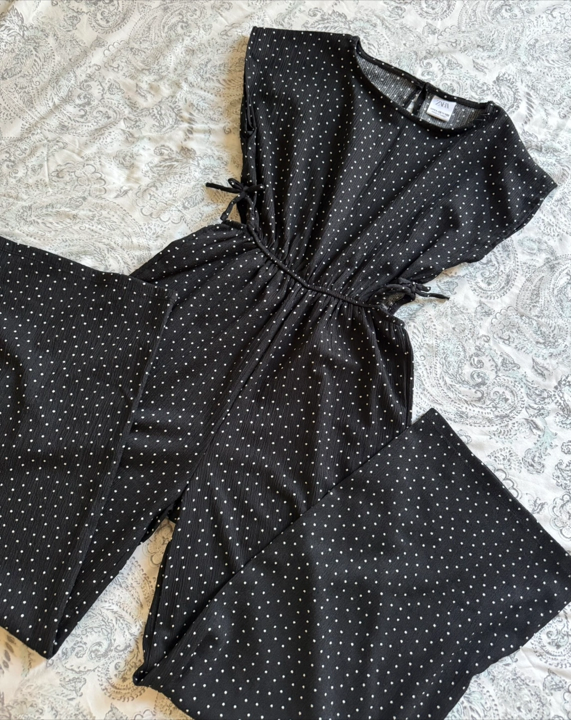 Cute Zara jumpsuit in a black and white polka dot pattern! The size is 11-12 (cm 152). It features a ribbon at the waist for a stylish touch. If you are size small this fit you.