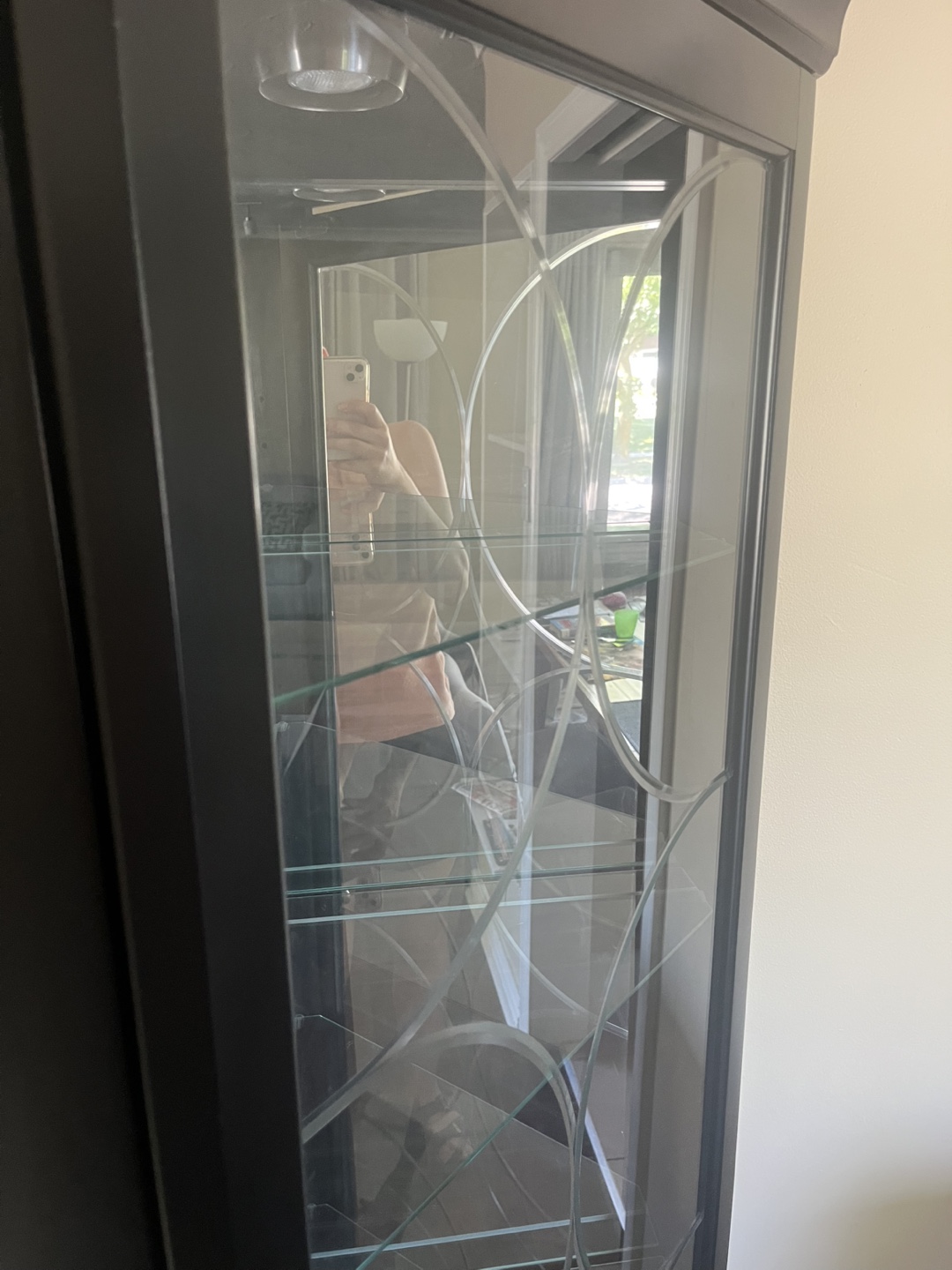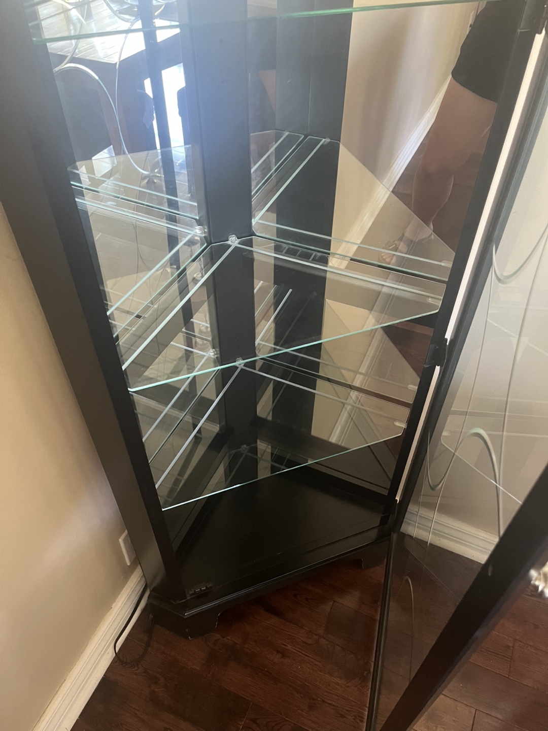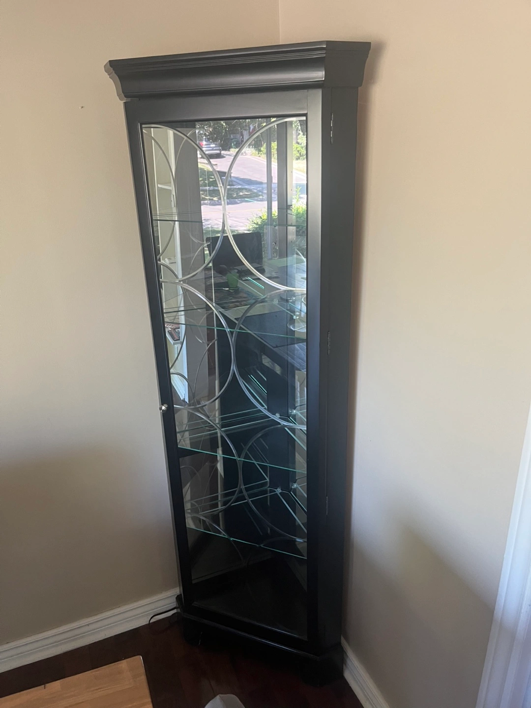 Selling this used corner curio in great condition. Features 4 glass shelves, etched glass door, a light and mirrors on the inside. Colour is black. Dimensions: Height: 73 3/4” Sides: 17” Front: 25” Pet free, smoke free home. Must be able to pick up and transport.