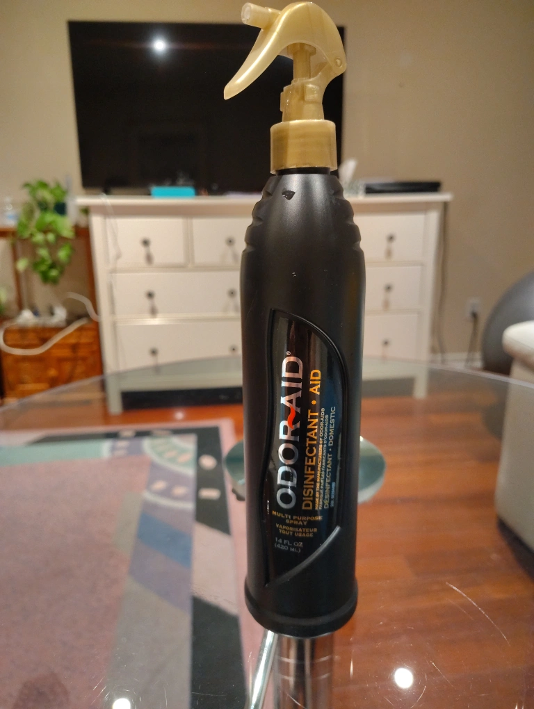 Selling a bottle of Odor Aid disinfectant spray. It's a multi-purpose spray and contains 14 fl oz (420 ml)