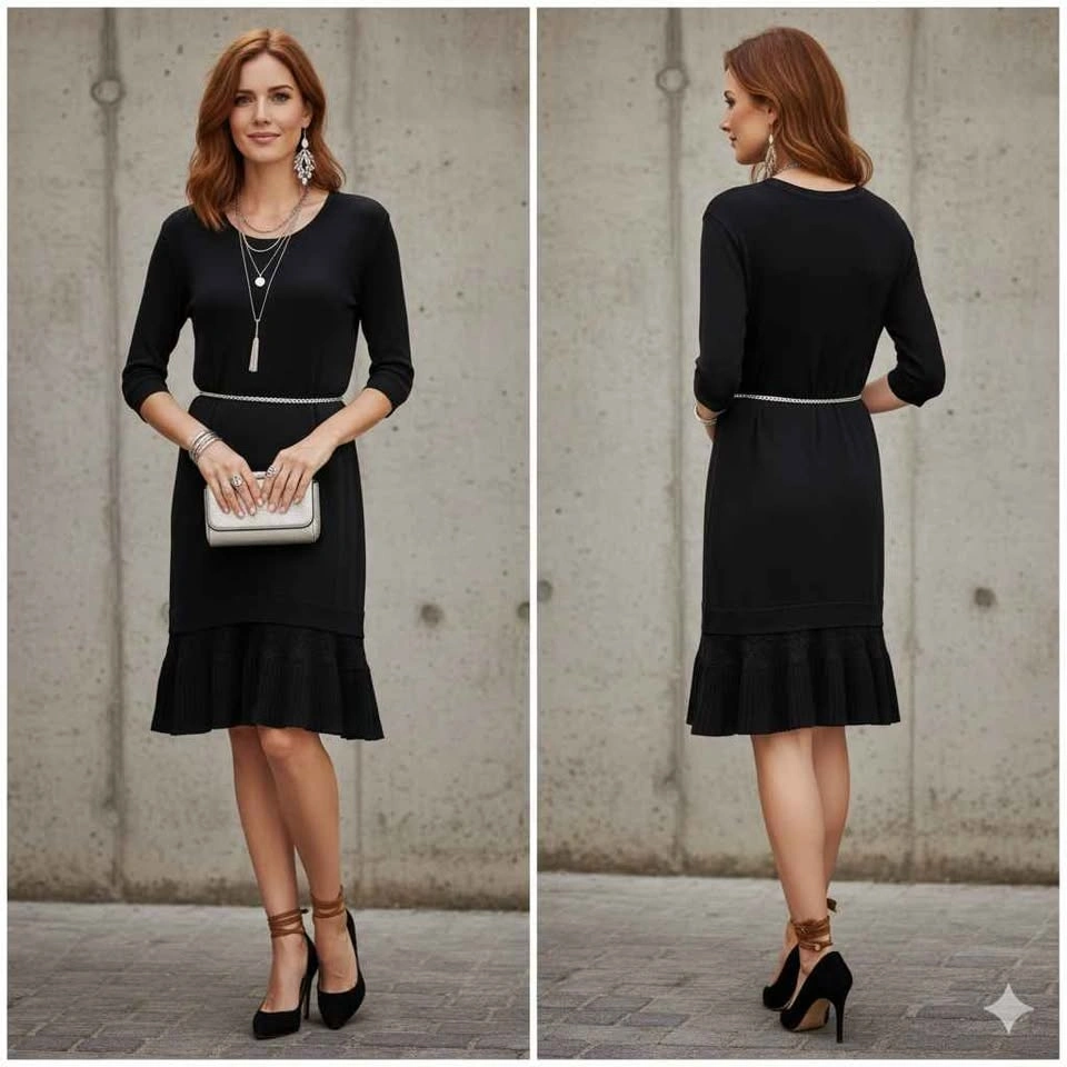 Half sleeve, scoop neck, T-shirt style with pleated skirt accents. Breathable. Can dress up or down - style suggestions pictures included.