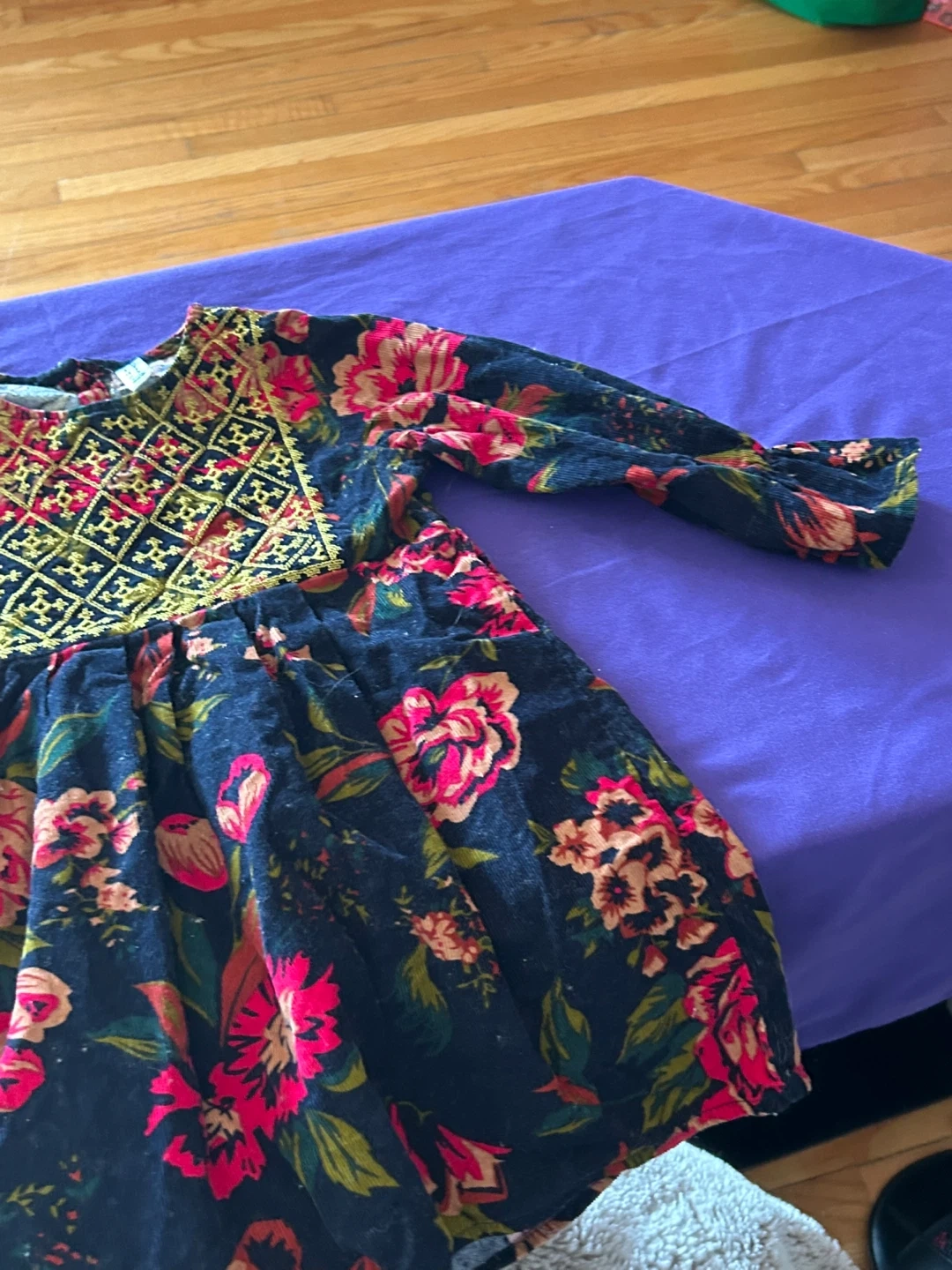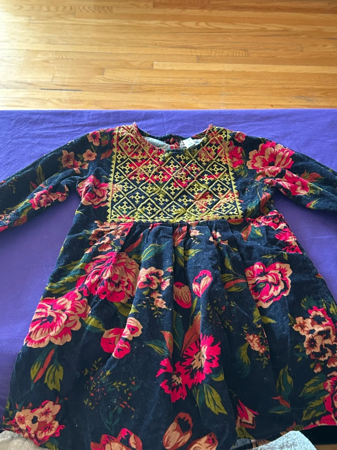 A cute floral corduroy dress perfect for cooler days. It features a detailed embroidered yoke and long sleeves. Made from soft corduroy fabric.