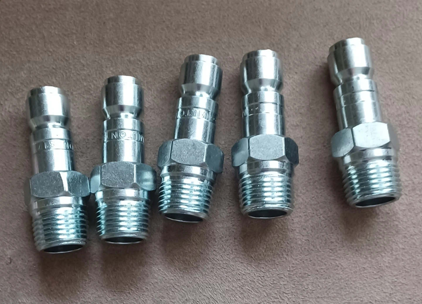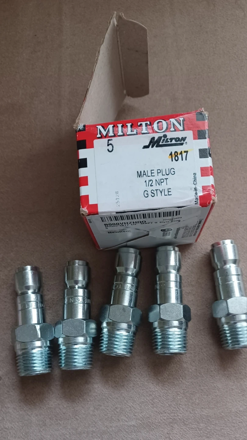This set includes five Milton male plugs with 1/2" NPT G Style fittings. They're made of durable metal for your air tool needs. These plugs are useful for connecting air hoses and tools. They're great for any workshop.
