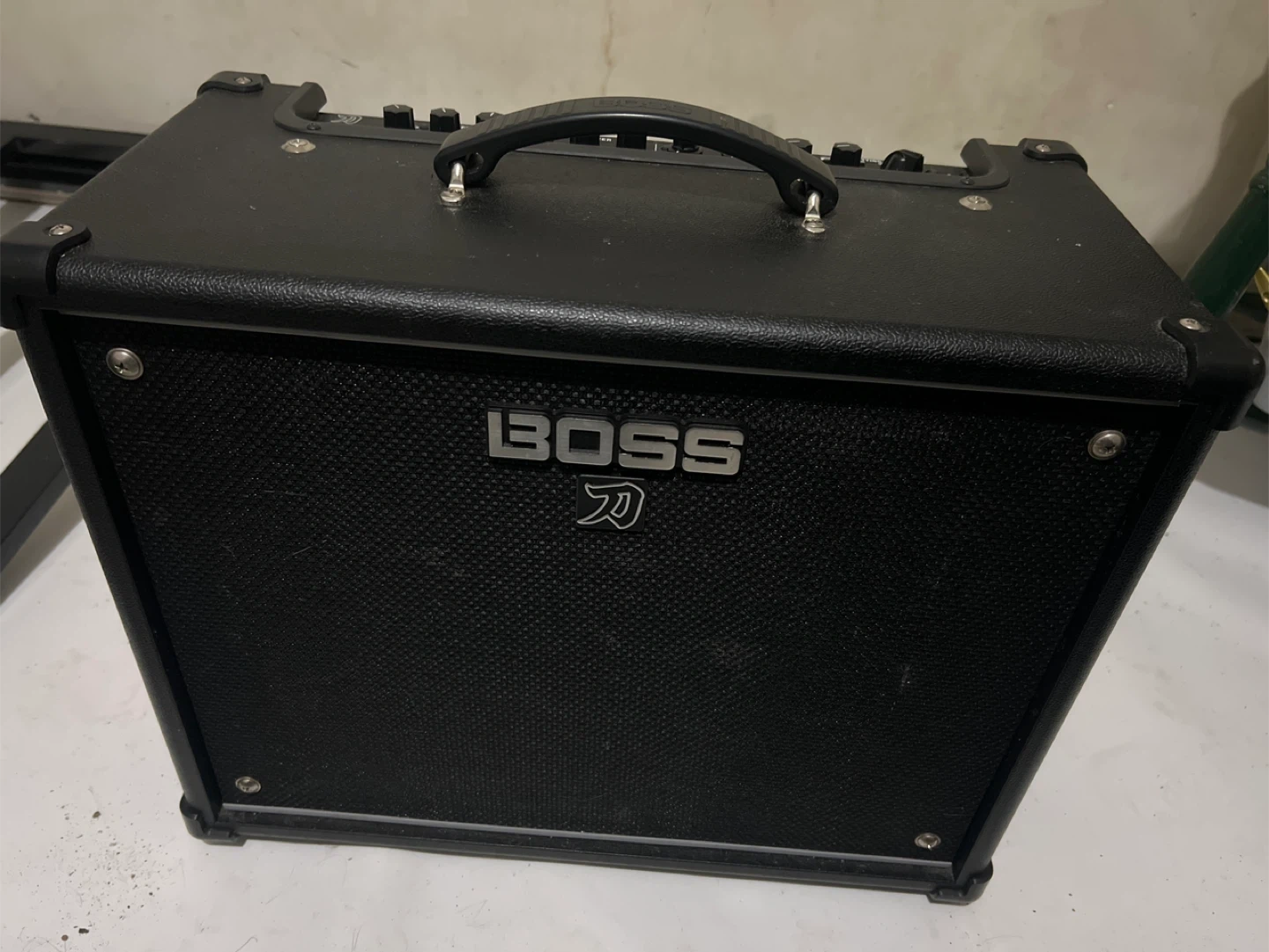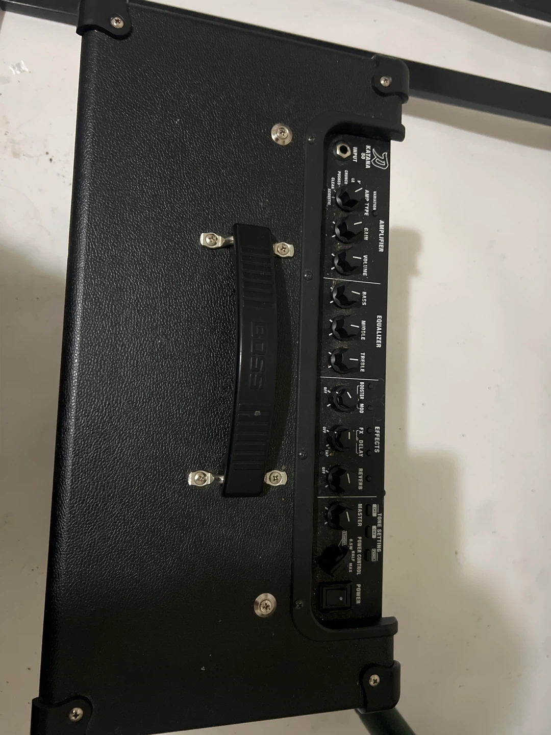 This is a BOSS Katana 50 guitar amplifier. It's black and includes a handle for portability. The amp has multiple EQ and effects settings. Awesome Amp that’s all I can say 👏 very little use so it’s almost like new