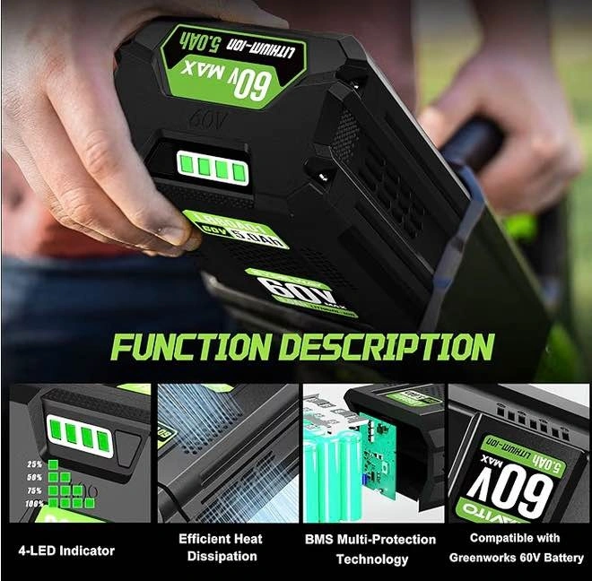 Replacement battery for Greenworks 60V cordless power tools. Compatible with models LB60A02, LB60A03, LB602, and LB6025. Offers an upgraded 5x longer runtime.