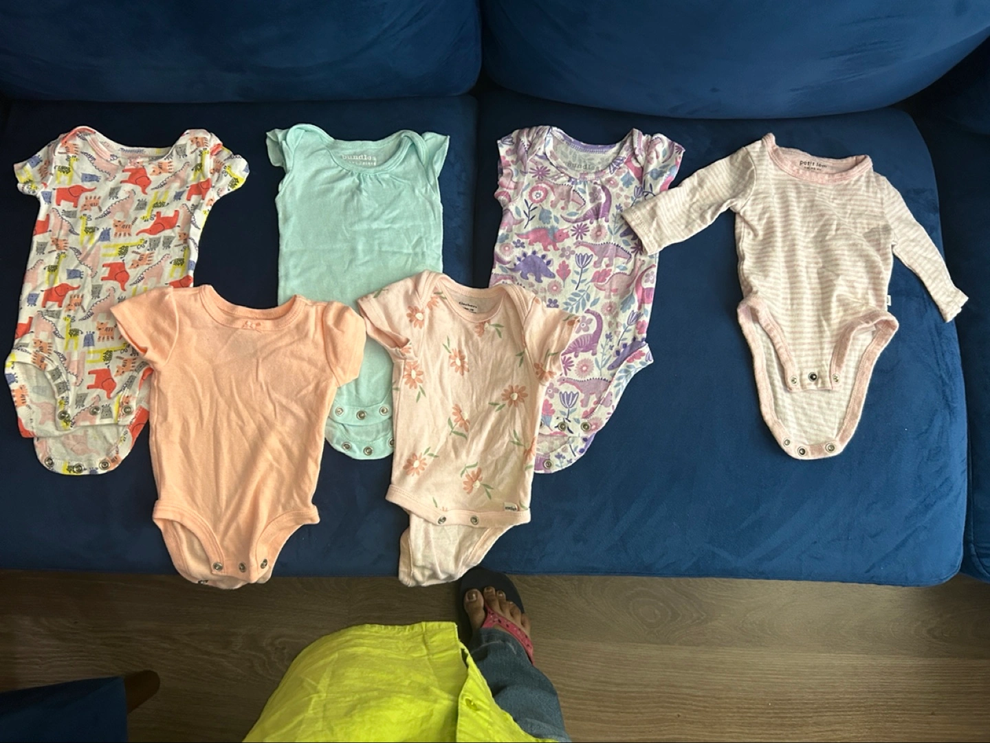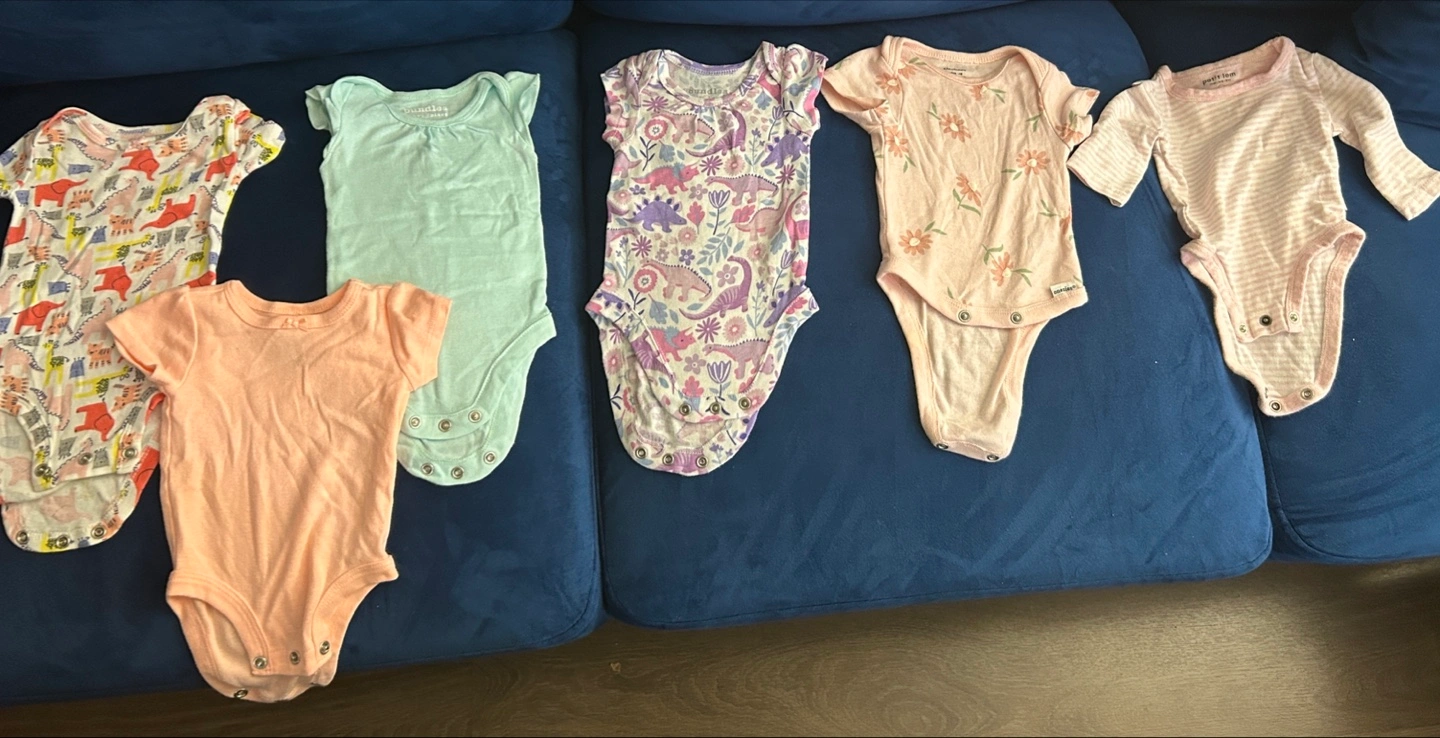 A cute collection of baby onesies in newborn size! There are 7 onesies in total, featuring a variety of colours and patterns, including dinosaurs and florals. All are in great condition and ready for a new little one
