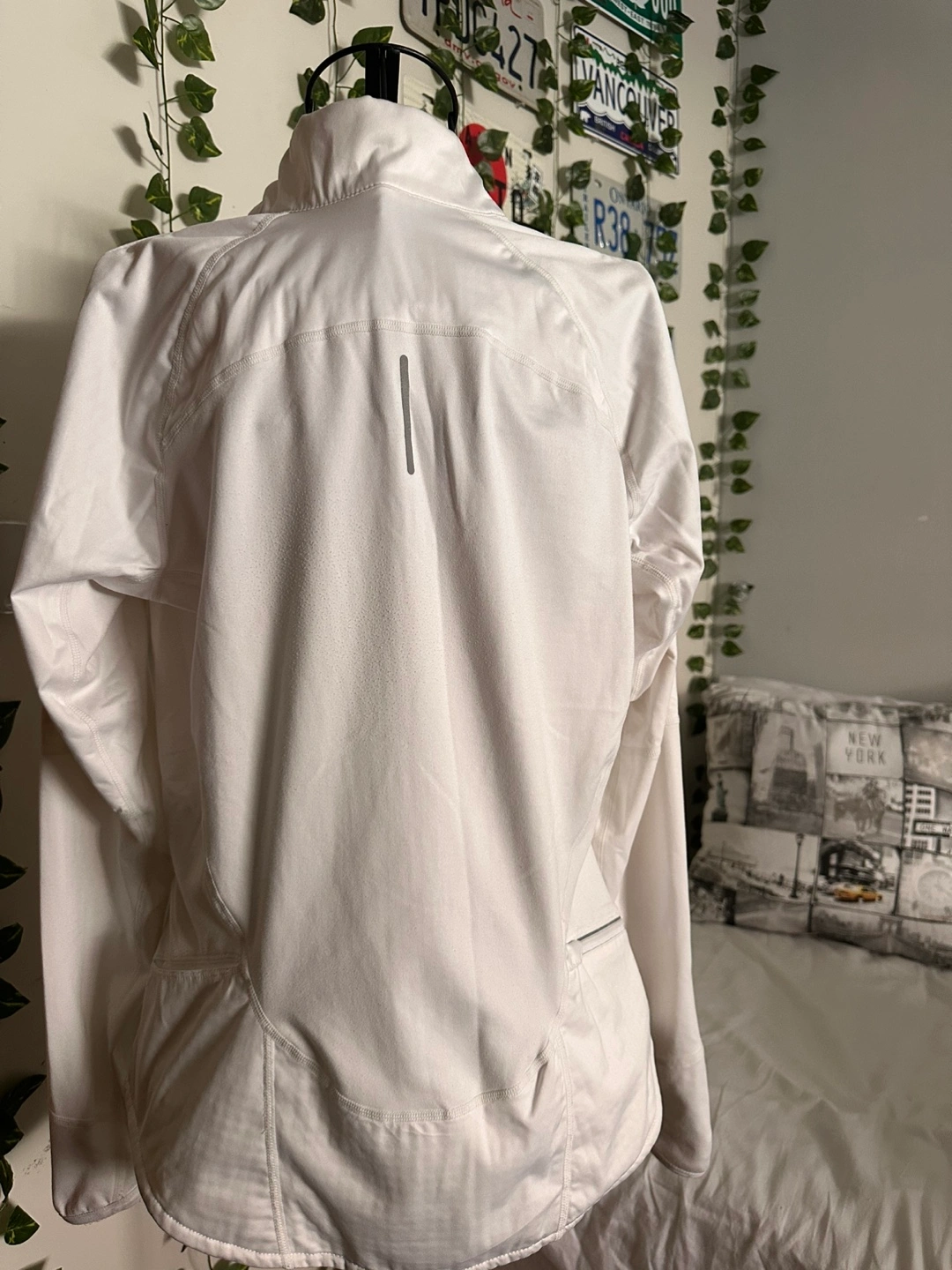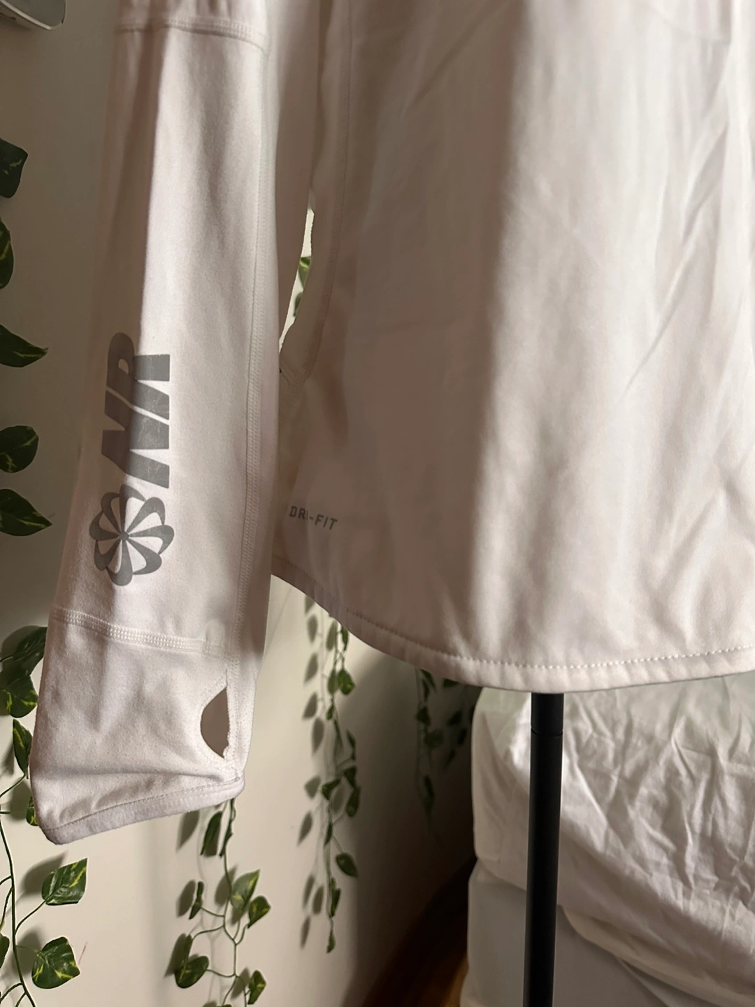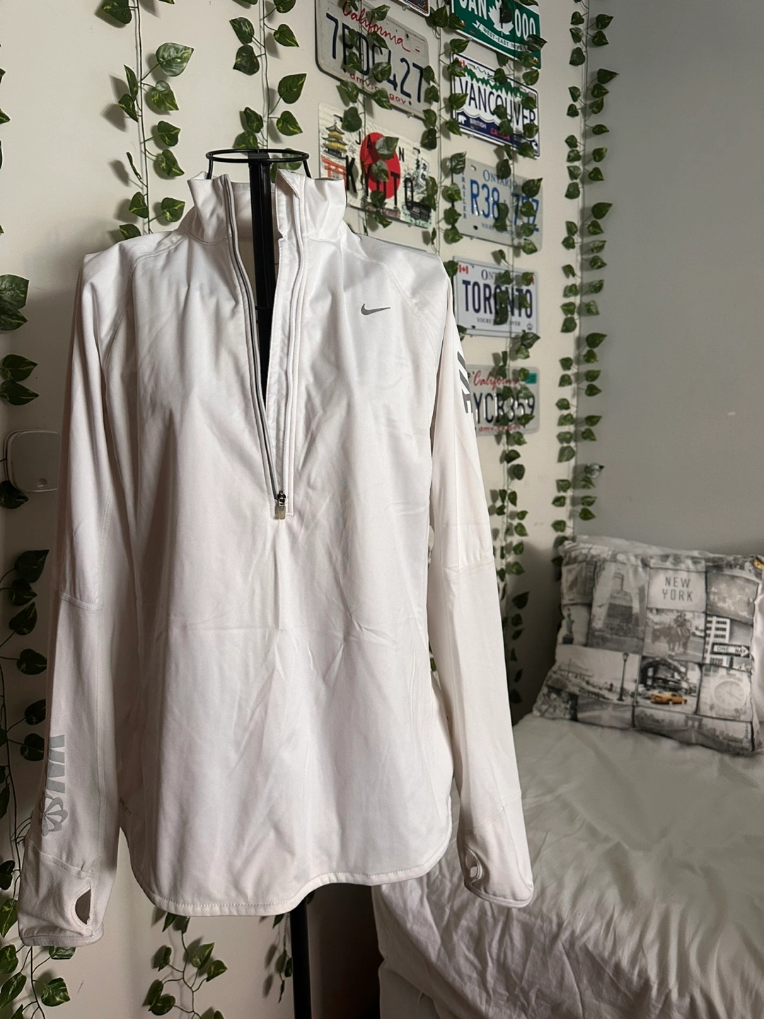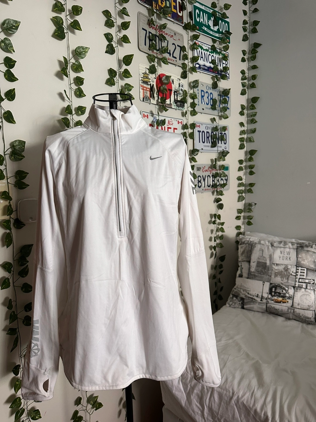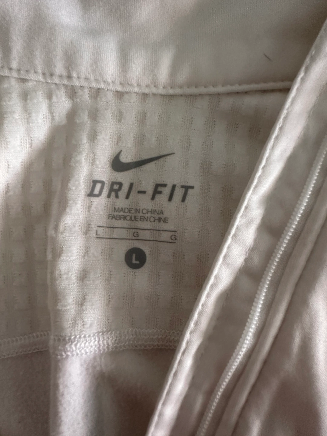 Selling a white Nike Dri-FIT running top in size large. It's in great condition and perfect for staying comfortable during your runs.