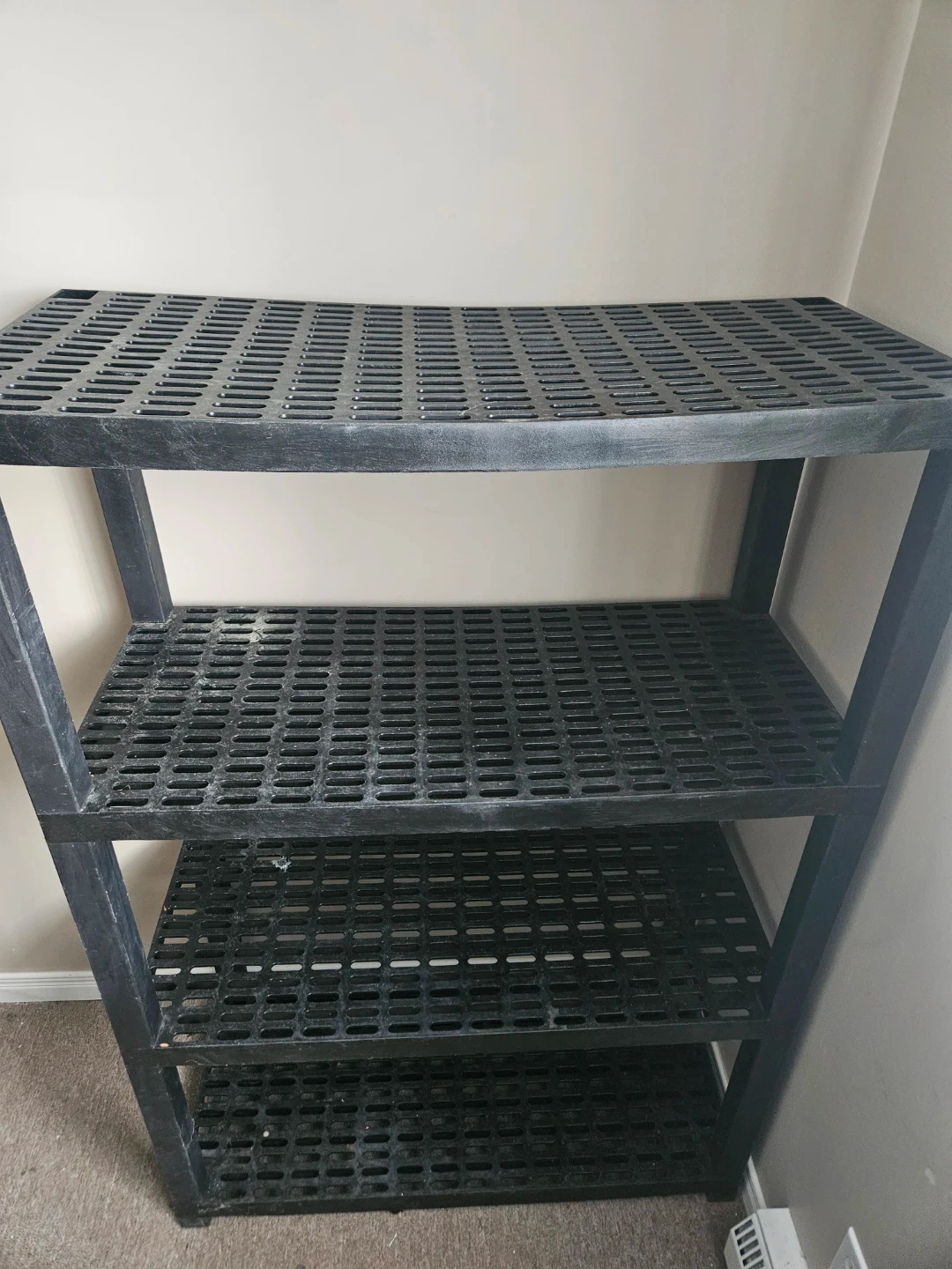 This black plastic shelving unit has four tiers. It's made of durable plastic and offers plenty of storage space. The open design allows for good air circulation.