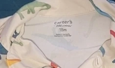 This Carter's Child of Mine pajama set features a fun all-over dinosaur print. It includes a short-sleeved button-up top and matching shorts. Size is 18 months. It's made from comfy cotton.