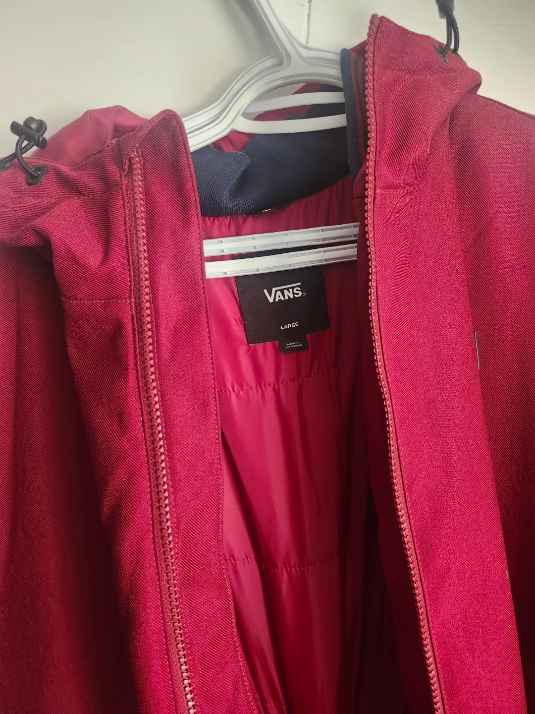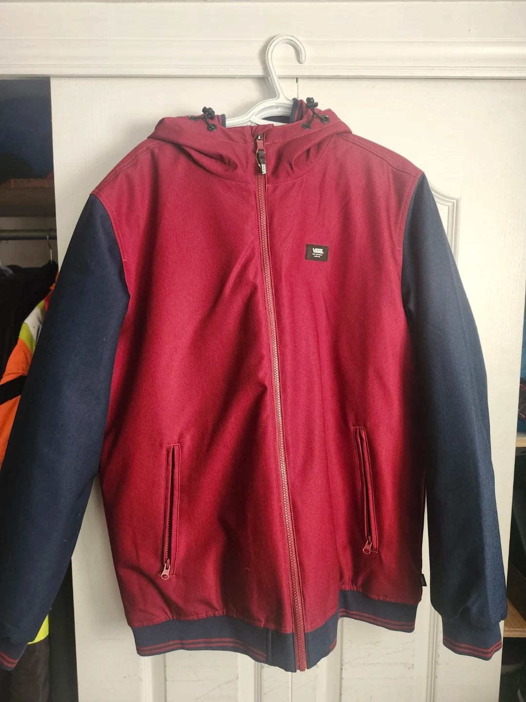 Selling a Vans jacket in size large. It's a stylish jacket with a hood and zipper closure. The jacket is brand new, never worn.