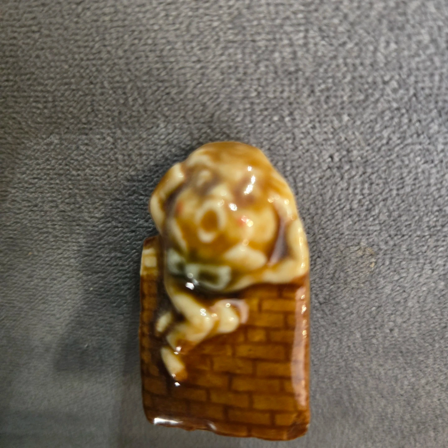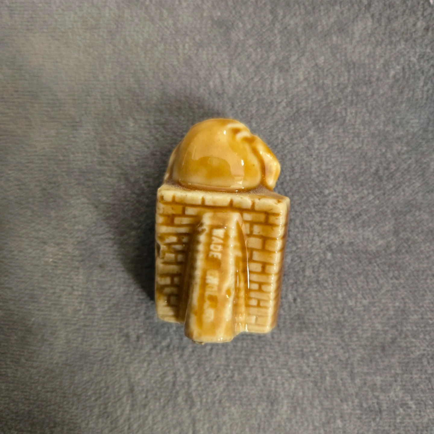 This is a cute humpty dumpty figurine peeking over a brick wall. It's a charming decorative piece. Made of glazed ceramic.