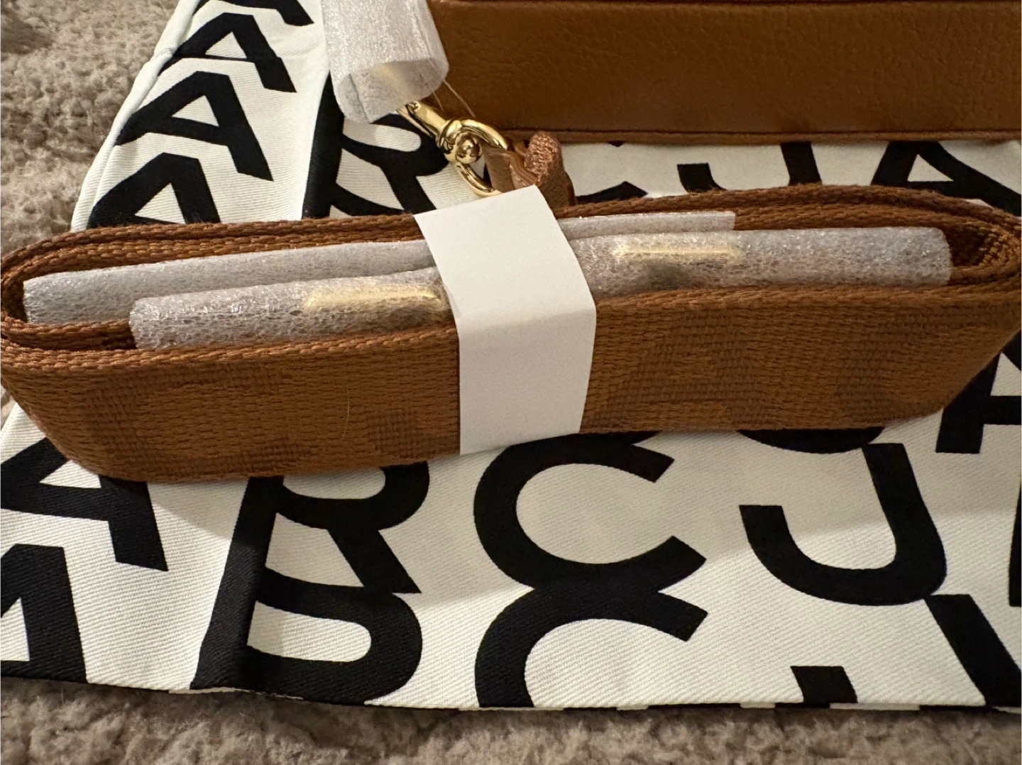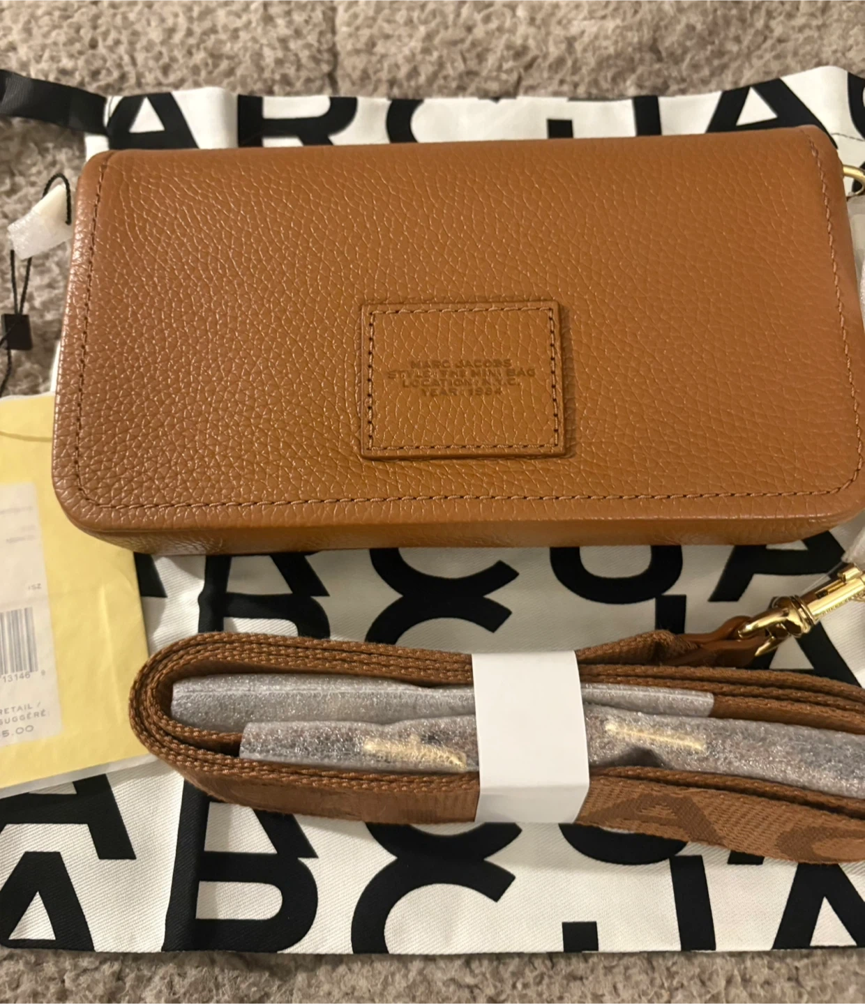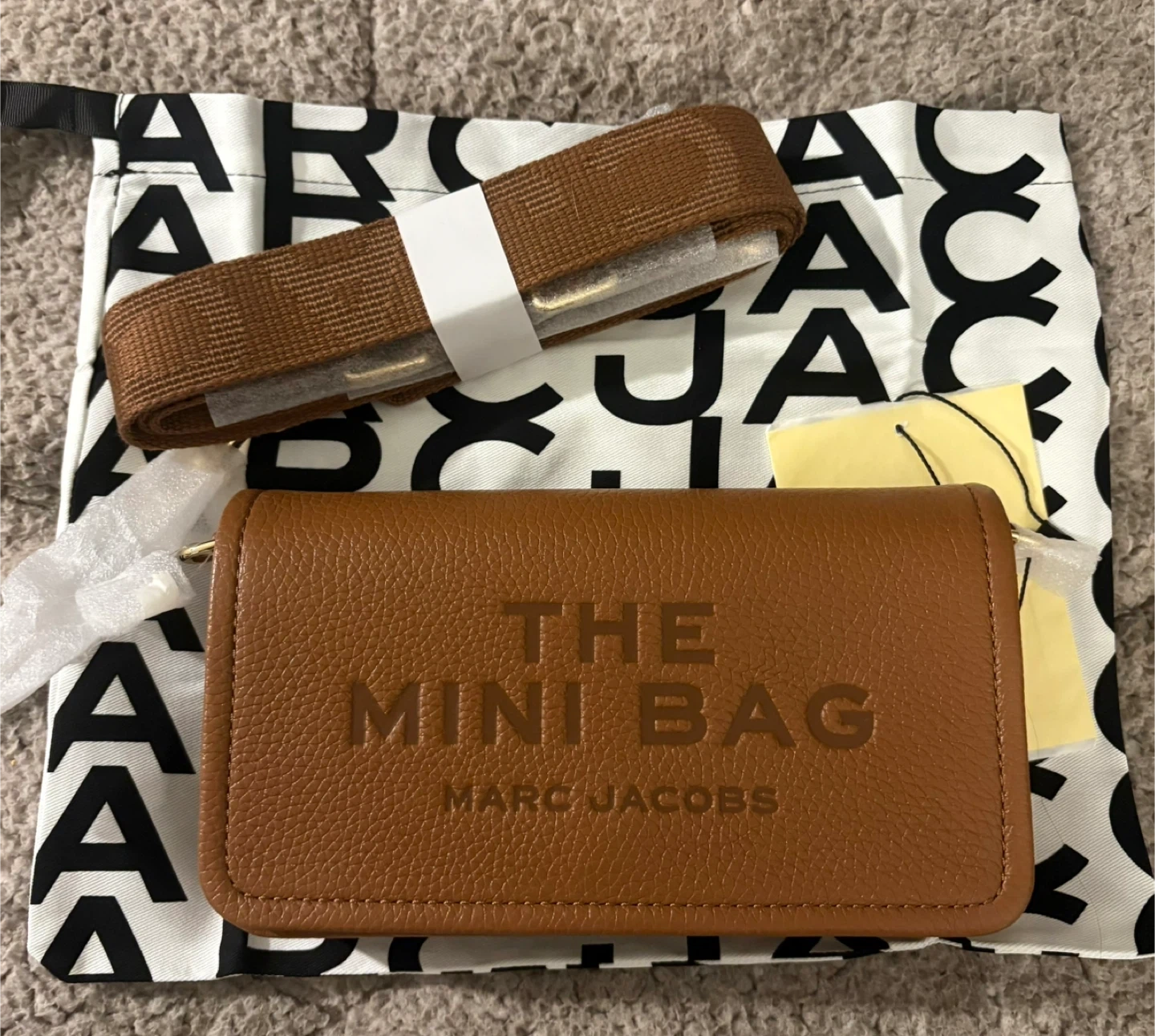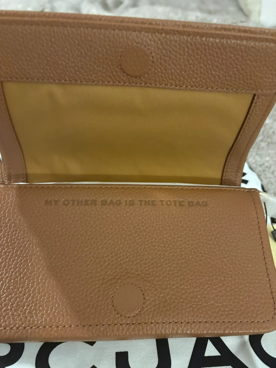 This is a brown leather "The Mini Bag" by Marc Jacobs. It's a compact wallet with card slots inside. Includes a dust bag. Brand new with tags! Pick up in Chestermere.