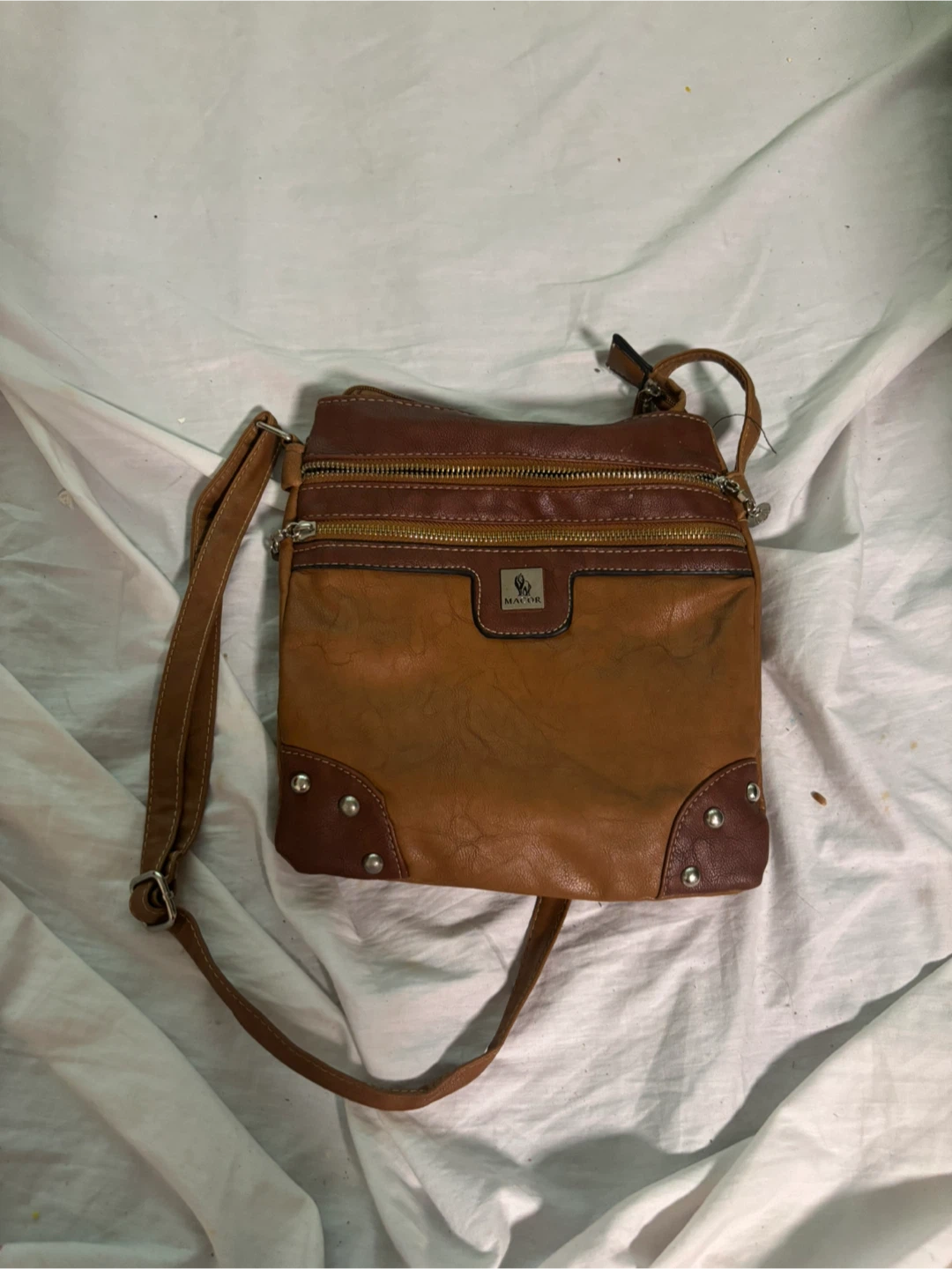 Here's a brown crossbody bag by Mayor. It's got a classic look with two-tone brown colours and silver hardware. Perfect for everyday use!