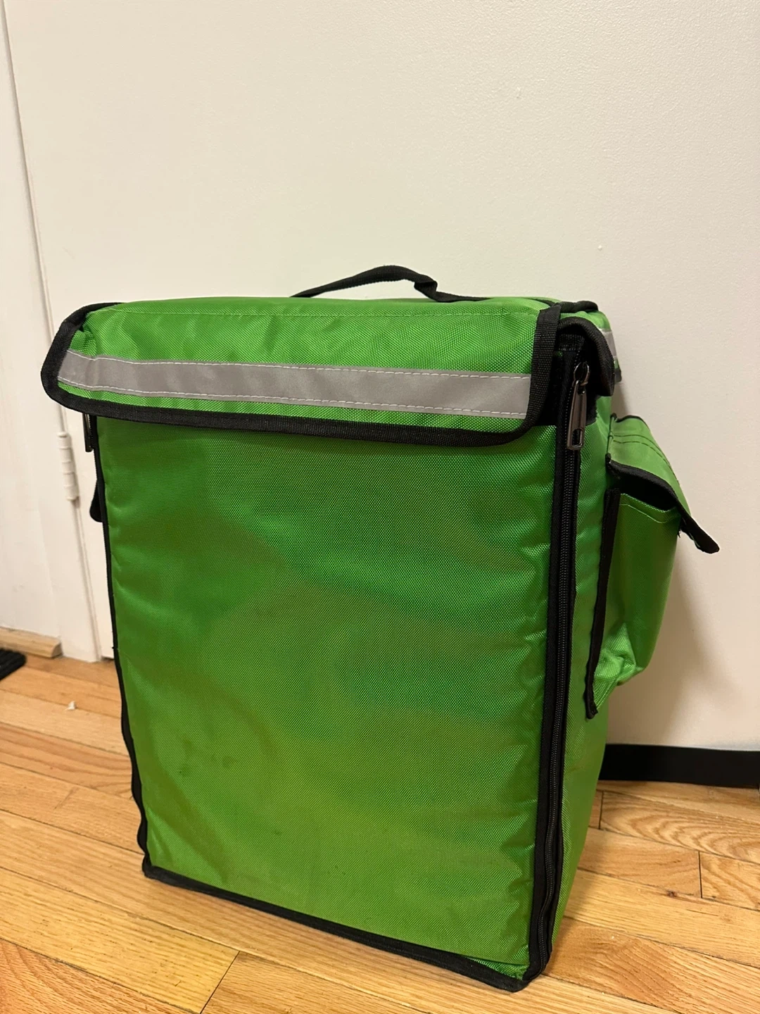 This insulated delivery bag is bright green with black trim and reflective accents. It has a spacious interior with reflective lining. It's perfect for food or grocery delivery services.