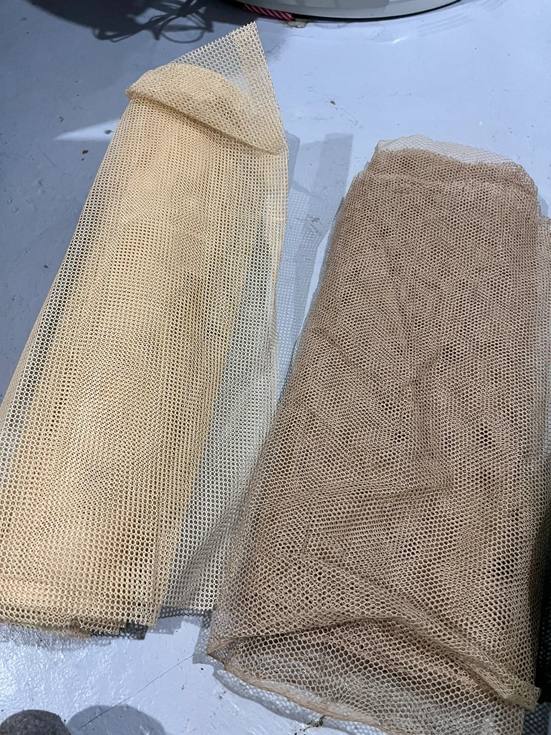 Two rolls of fine mesh fabric. One is a light beige colour, the other is a tan colour. Both appear to be similar in texture and weave. Perfect for crafts or costume making!