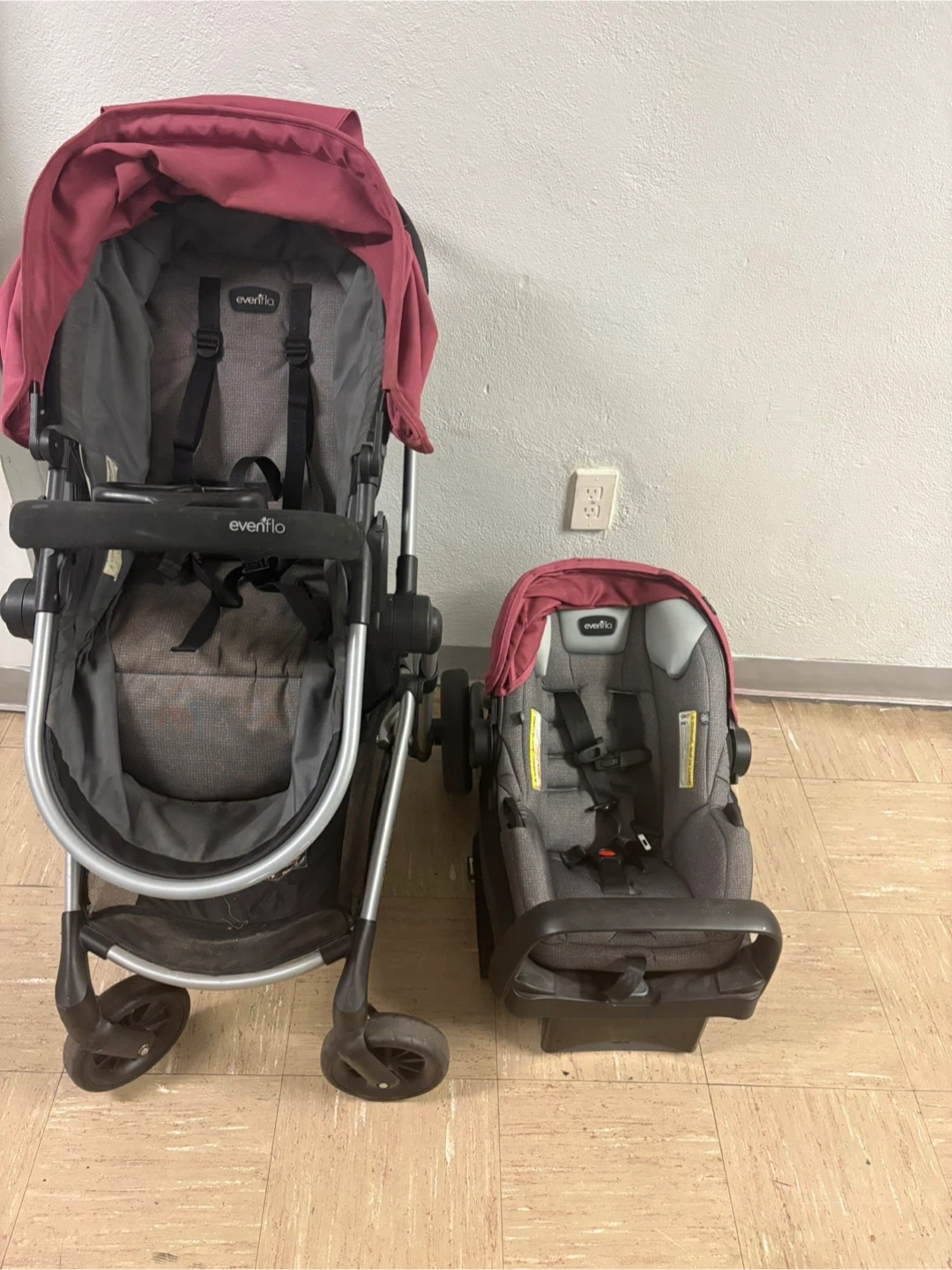 This Evenflo Pivot travel system includes a stroller and infant car seat. The stroller has a reversible seat and a large canopy. The car seat has a secure base and adjustable harness. It's a convenient setup for on-the-go parents!