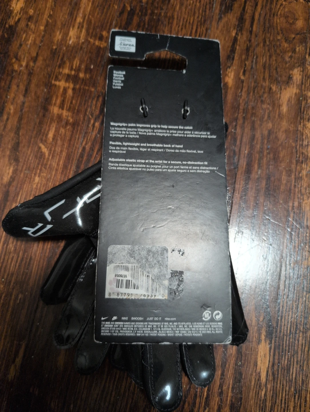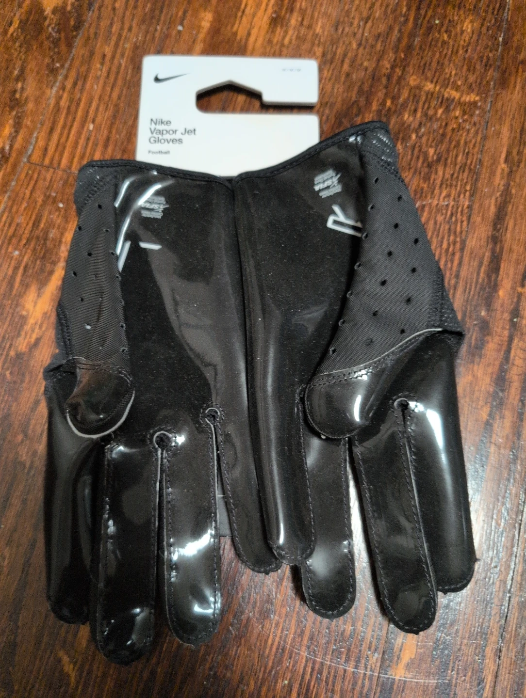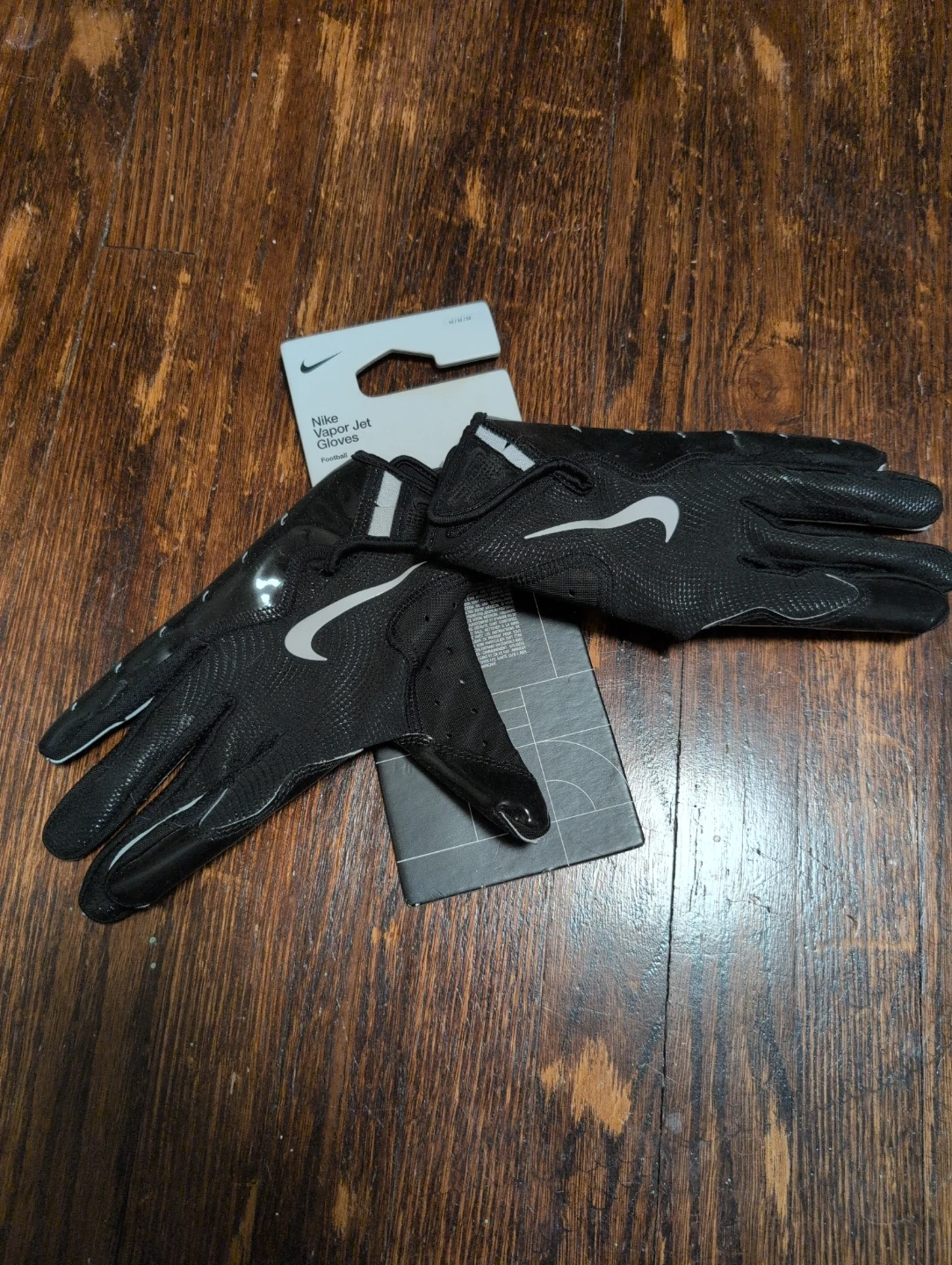 These brand new Nike Vapor Jet football gloves are black. They're a size medium. The gloves feature Magnigrip palms for a secure catch and an adjustable elastic strap at the wrist for a no-distraction fit. They're flexible, lightweight, and breathable.