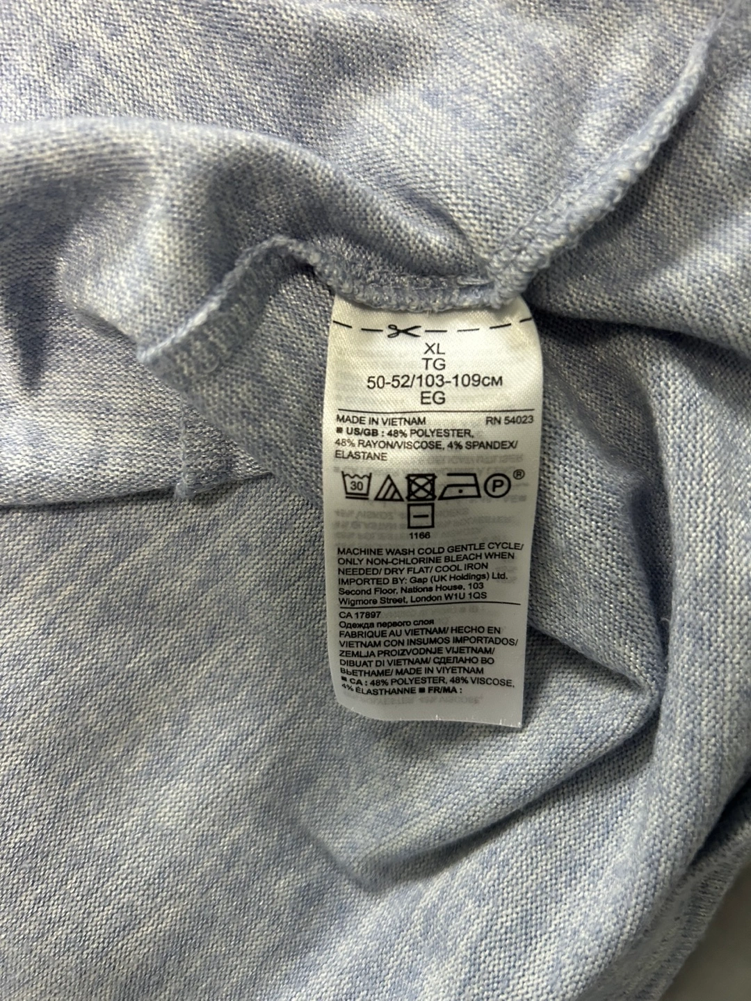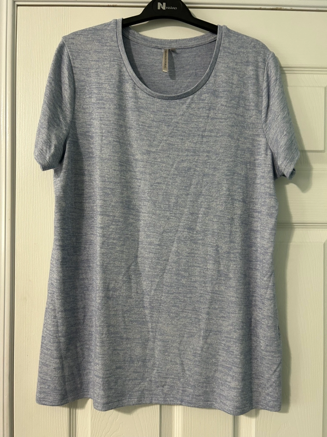 It's a lovely light blue colour and made from 46% polyester, 46% rayon/viscose, and 4% spandex/elastane