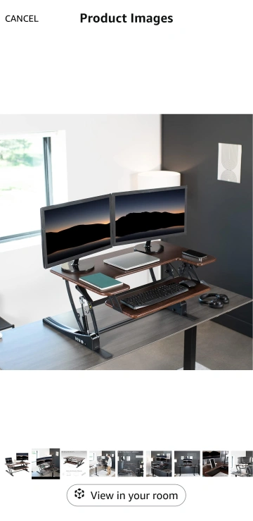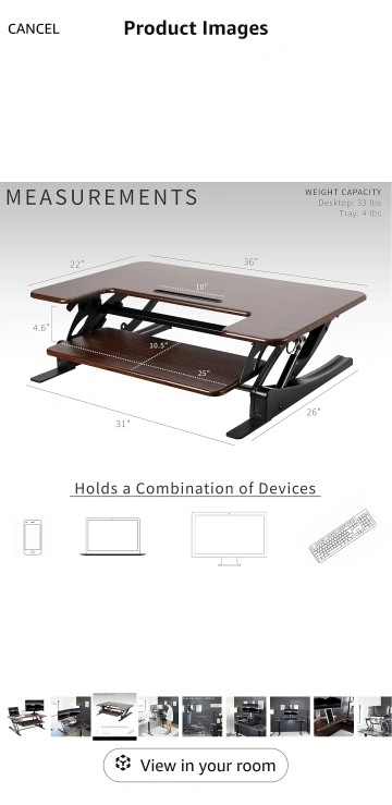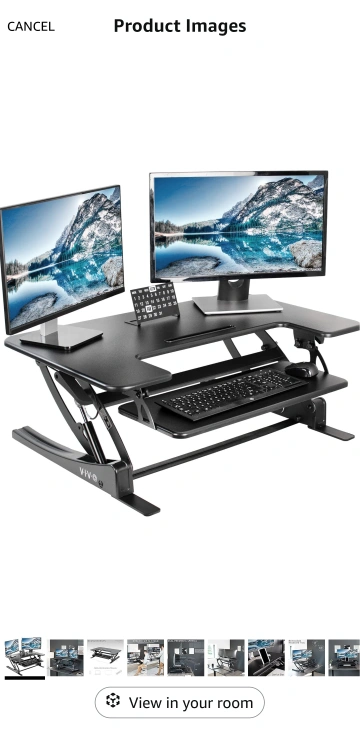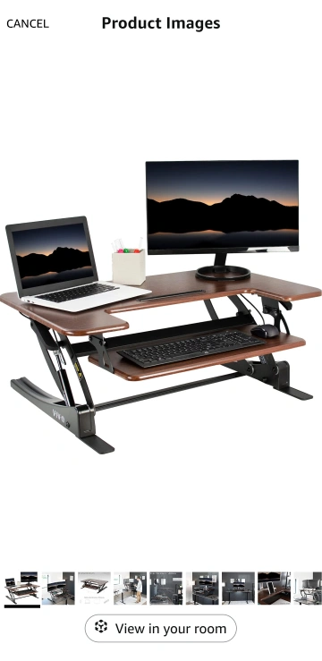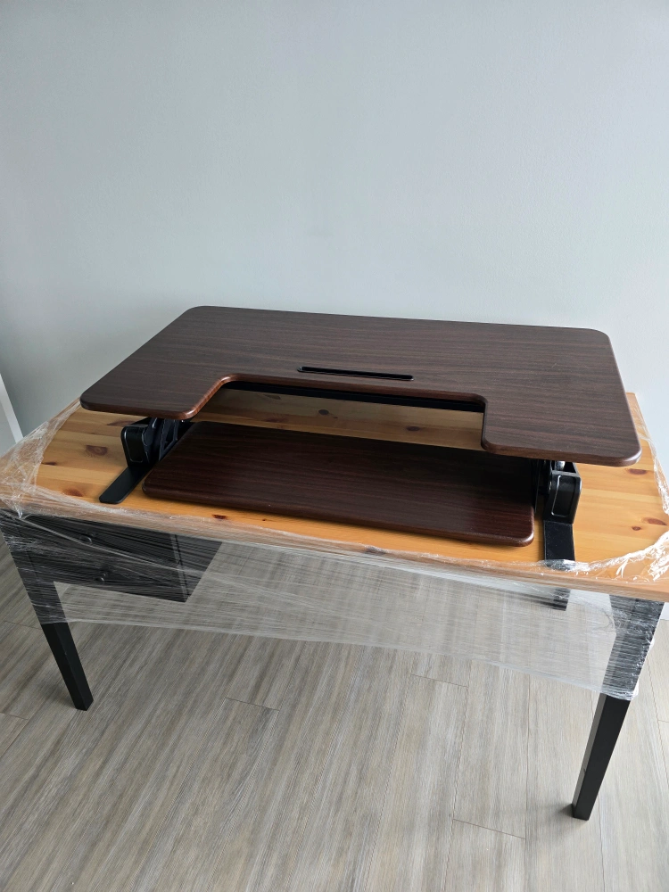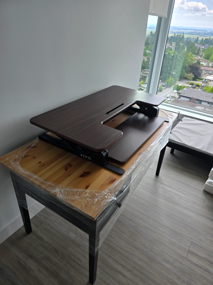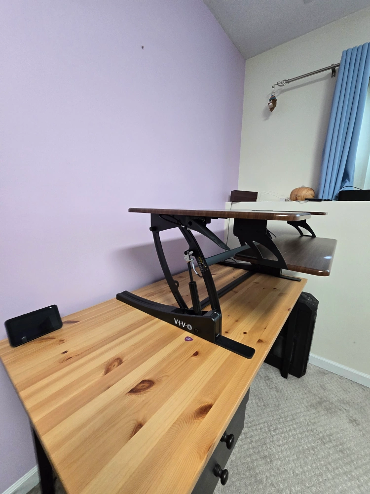 Selling a VIVO standing desk converter in dark wood. It's in great condition and ready to help you work more comfortably! The dimensions are 36" x 22" for the desktop and 25" x 16.5" for the tray