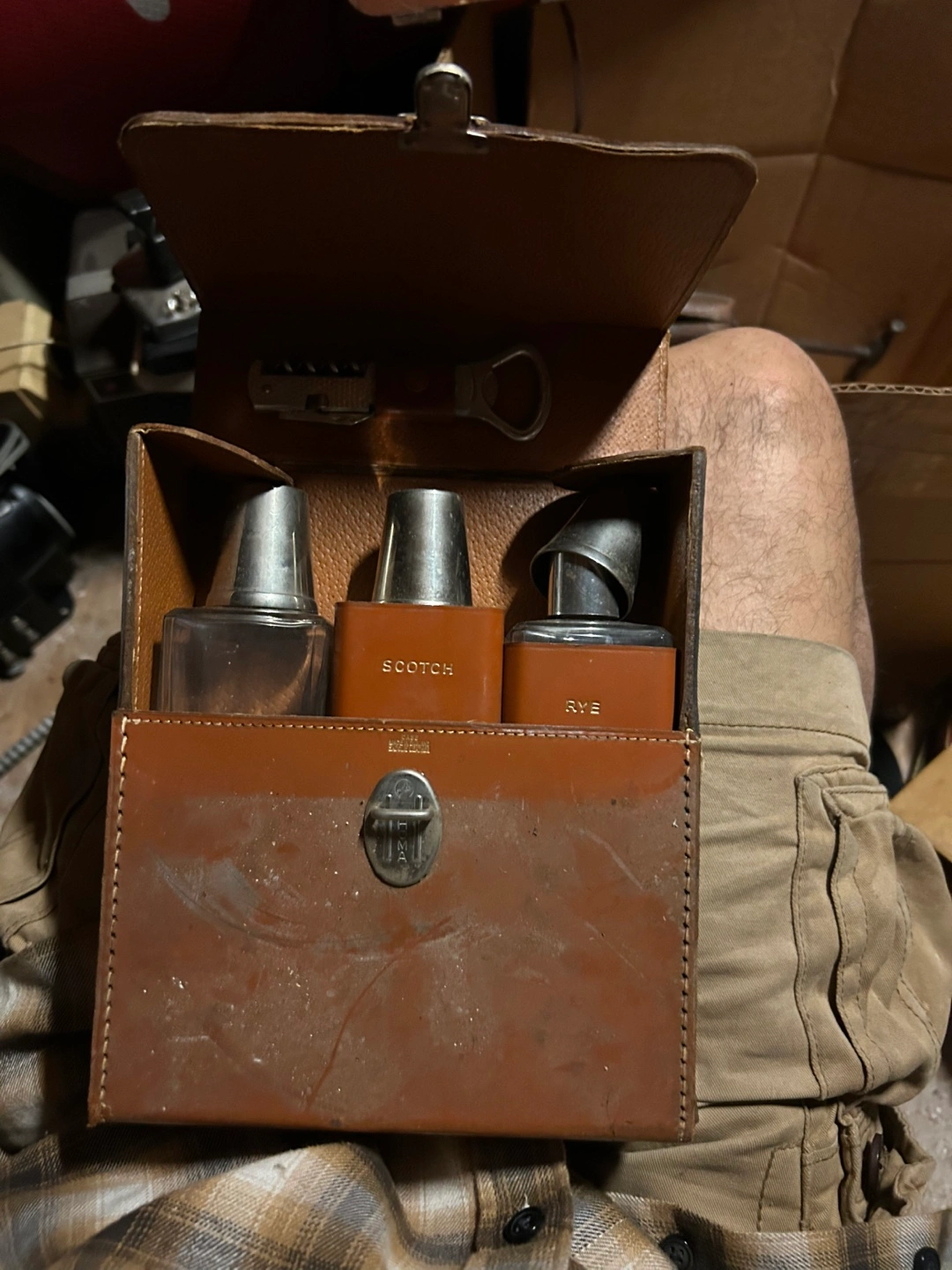 Selling a vintage leather travel bar set! Includes three glass bottles labeled 'Scotch,' 'Bourbon,' and 'Rye,' along with some bar tools. Perfect for a collector or anyone who appreciates a bit of retro style on the go