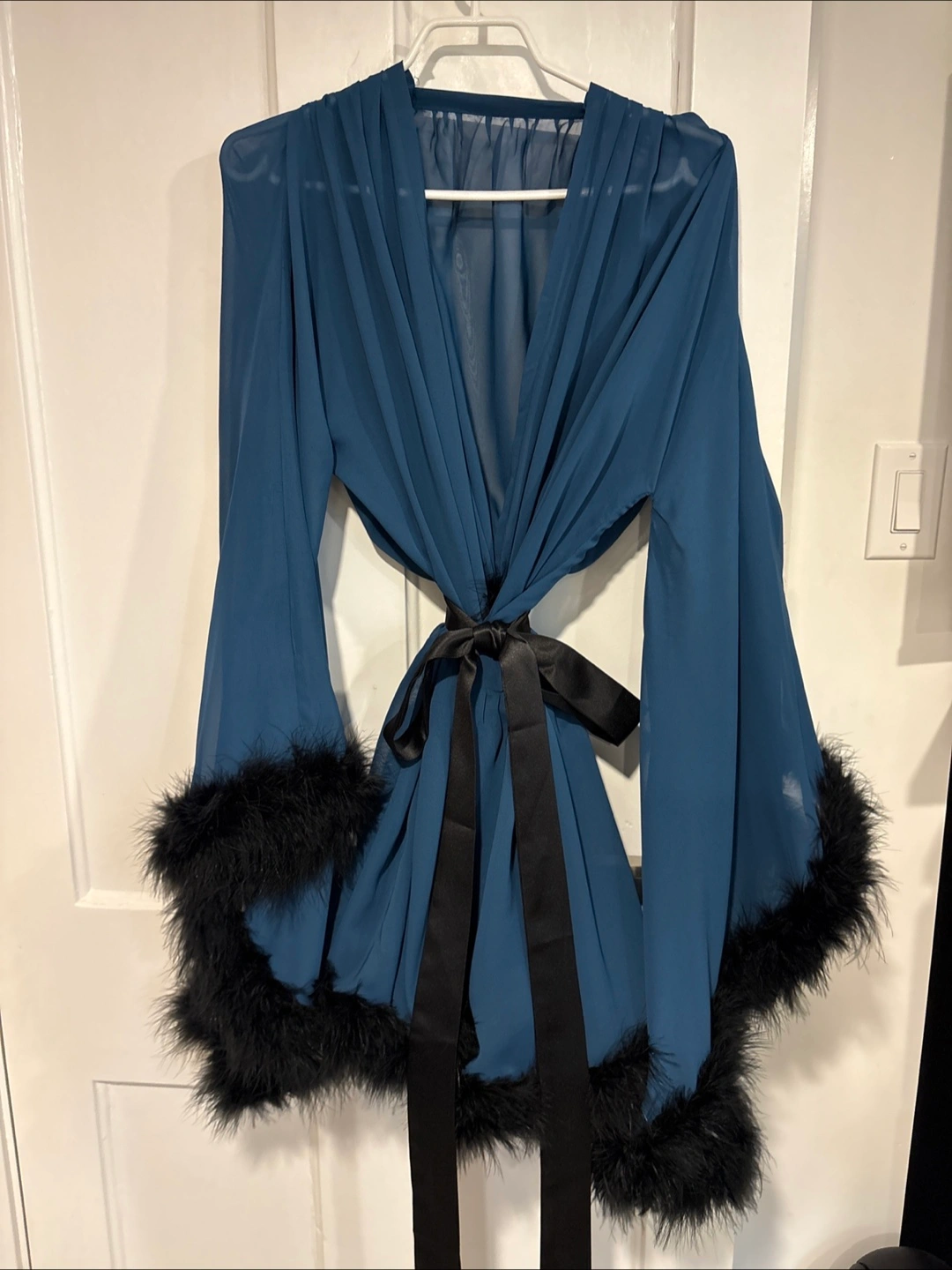 Brand new Molisa short chiffon robe with real feather trim. It's a lovely teal colour and has a long good quality black tie. Perfect for lounging or as a bridal robe. Retails for $85 plus $50 shipping (lol). Size small but very forgiving. I tend to be a medium - large often and it fits fine.