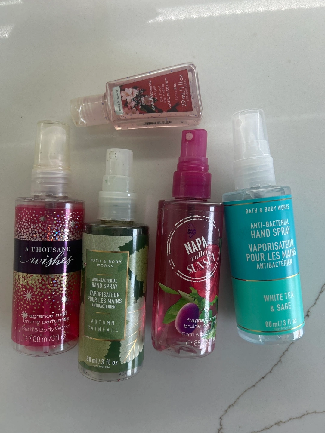 Selling a bundle of various Bath & Body Works 2 anti-bacterial hand sprays, 2 body mists, and a hand gel.