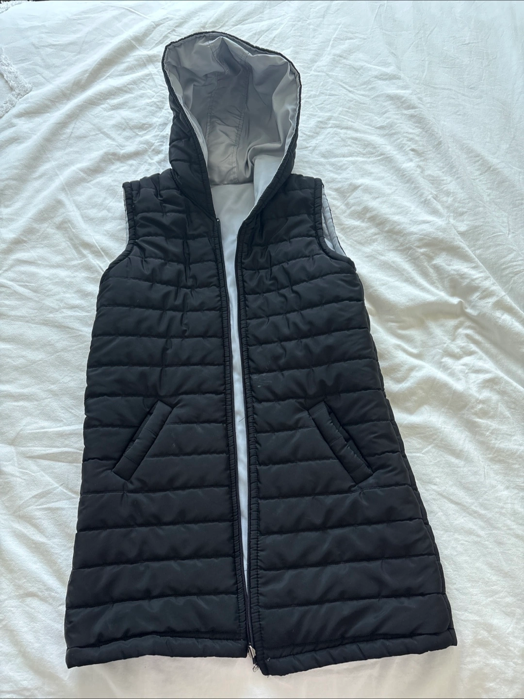 Selling a black puffer vest with a hood. It's in great condition and perfect for layering during the colder months. It has a zipper closure and pockets on the front.