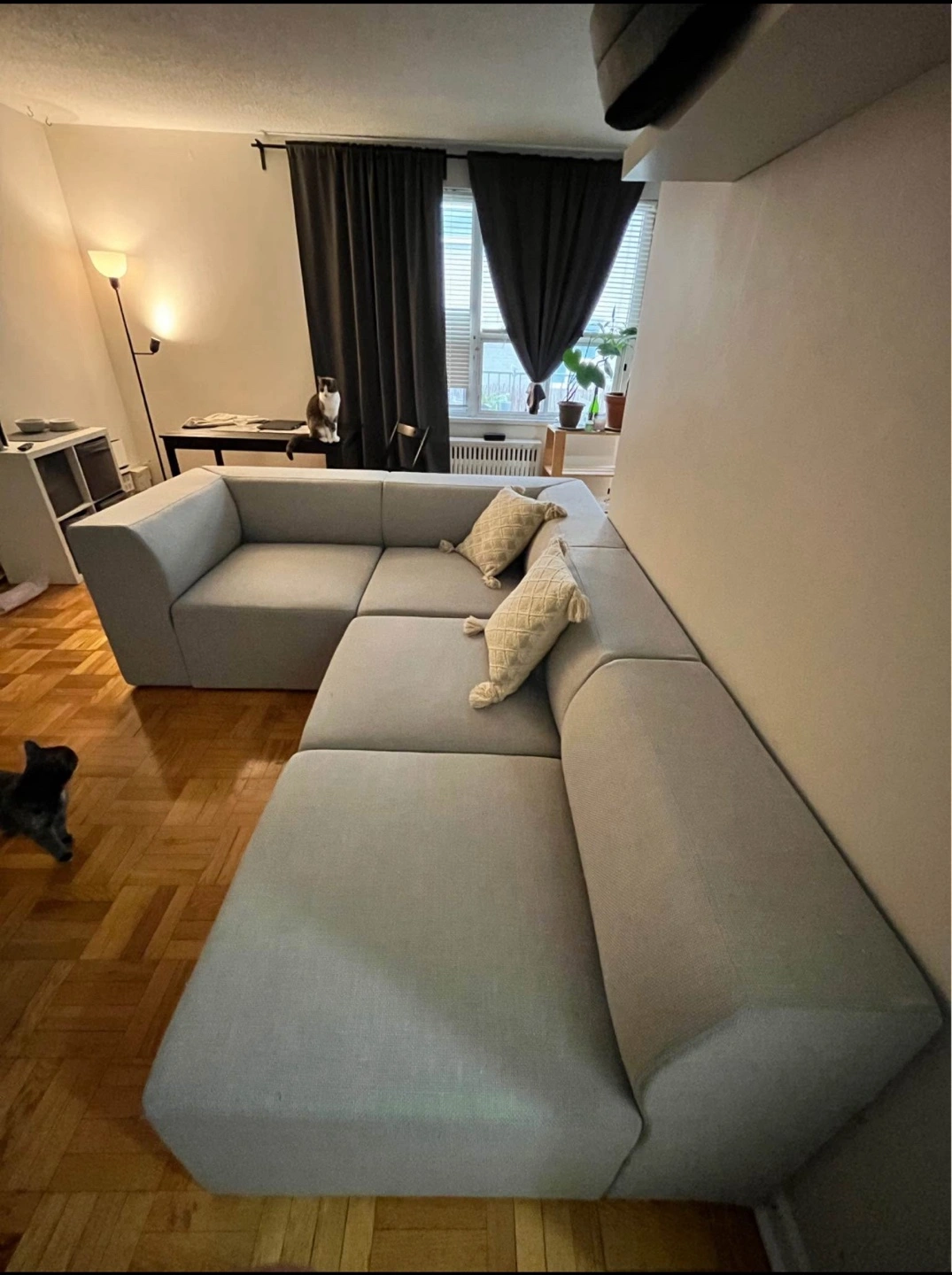 Four-piece modular sofa sectional. Light grey fabric. Includes two throw pillows. Good condition. Easy to assemble and reconfigure.