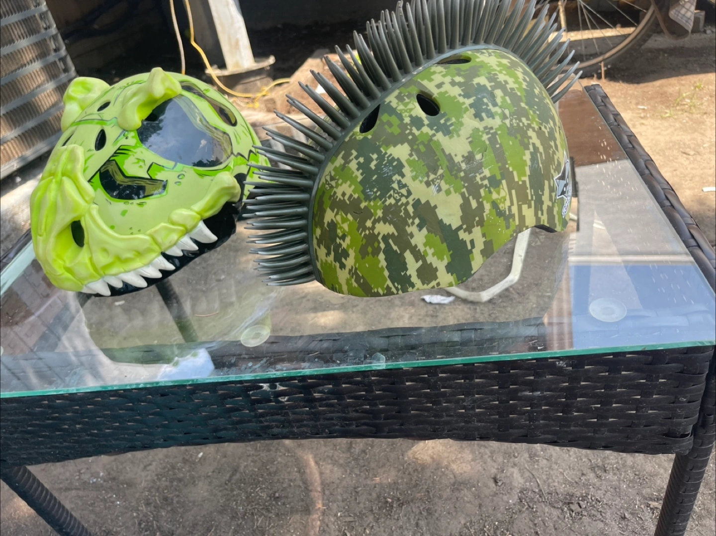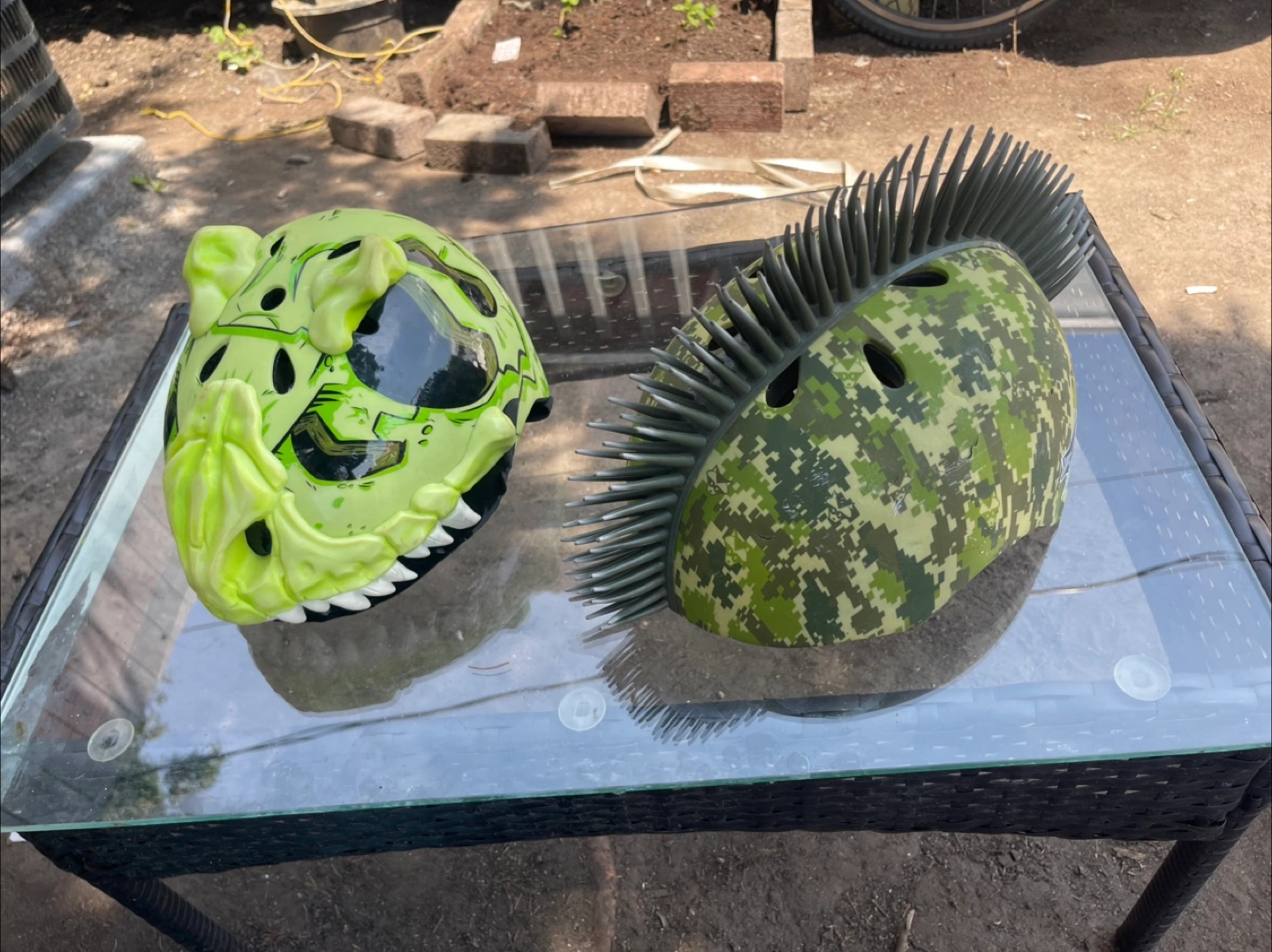 Selling two novelty helmets for kids. One is a dinosaur design, and the other has a mohawk style. Both are in good condition and ready for a new home!