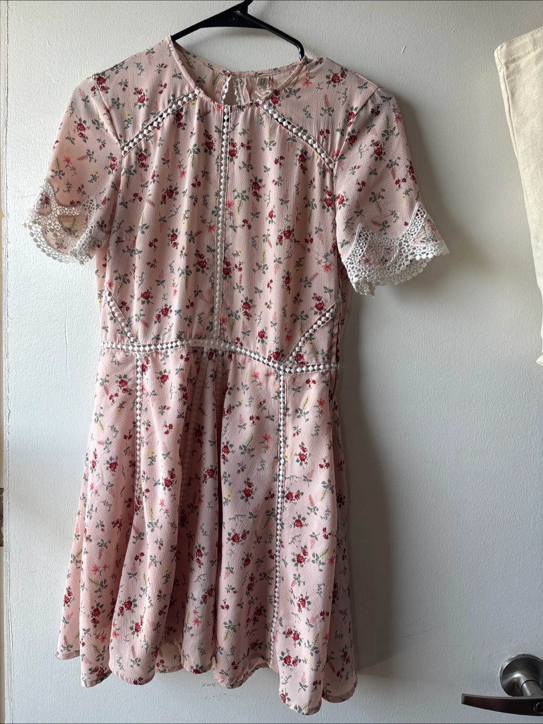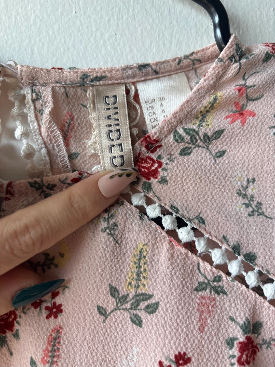 Selling a super cute floral dress from Divided! It's a size 6 and features a lovely floral pattern on a light pink background. Perfect for spring or summer!