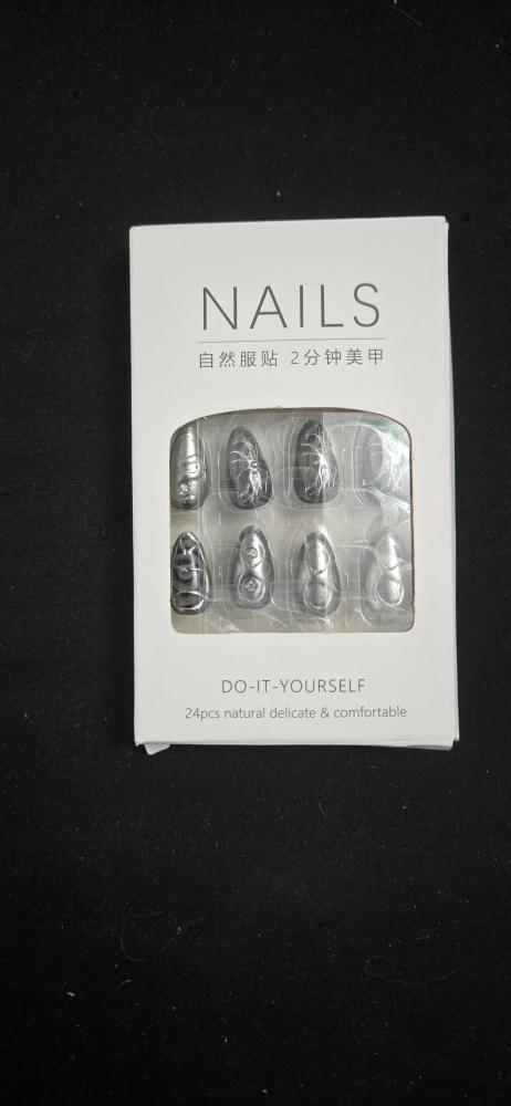 Selling a new set of DIY press-on nails! This set comes with 24 pieces and are designed to be natural, delicate, and comfortable. They're silver in colour with a unique design on each nail. Perfect for a quick and easy manicure at home