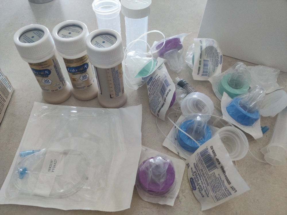 3 Enfamil NeuroPro 20 ready-to-feed bottles and various nipples. Includes extra slow-flow soft nipples and feeding tubes