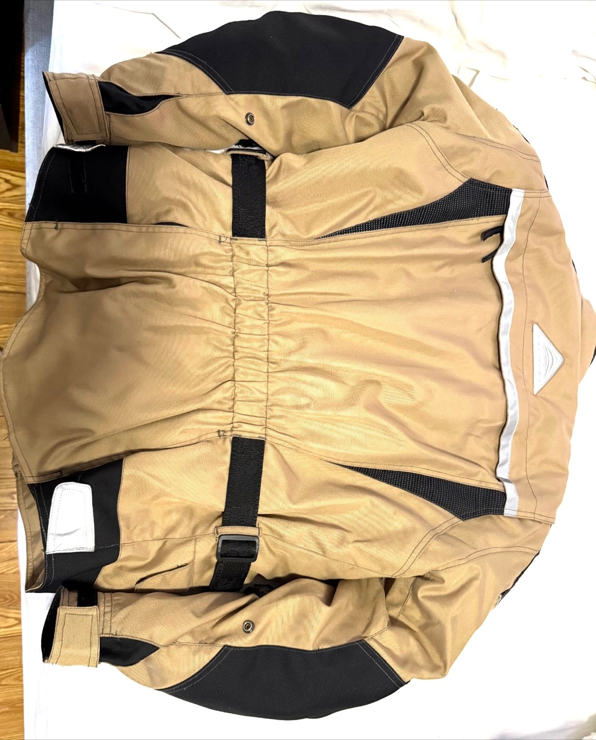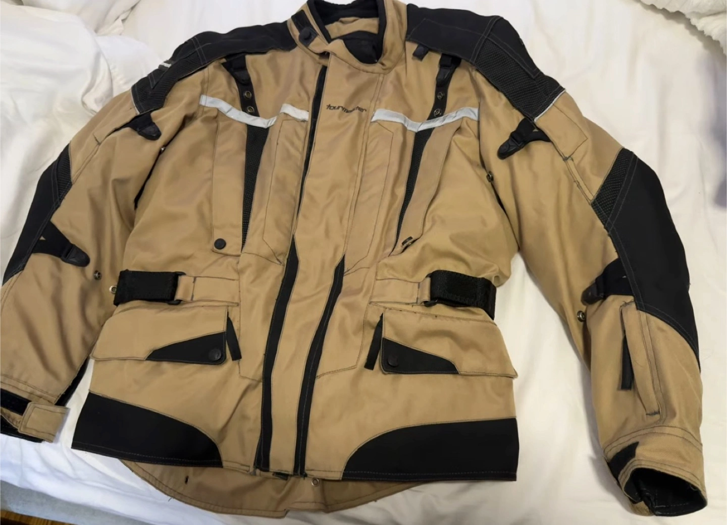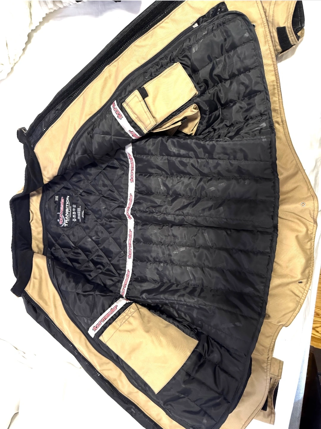 Selling a Tour Master Transition Series 5 jacket in great condition! The jacket is a tan color with black accents. It has a quilted black interior lining and several pockets, making it very functional. Perfect for motorcycle riding or outdoor activities!