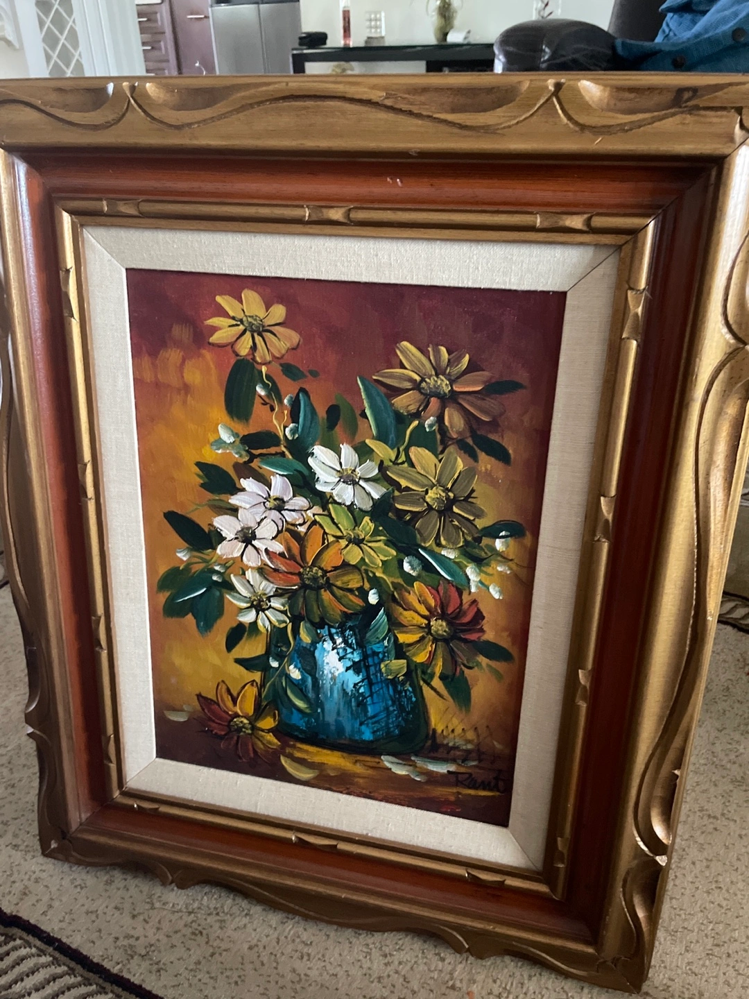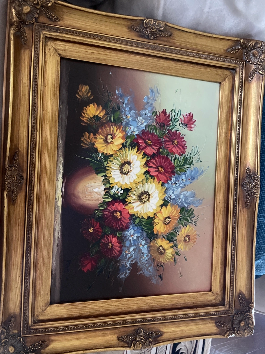 552Beautiful vintage floral oil painting with a detailed ornate frame. The painting features a vibrant bouquet of flowers in rich, warm tones. It would make a lovely addition to any room!
