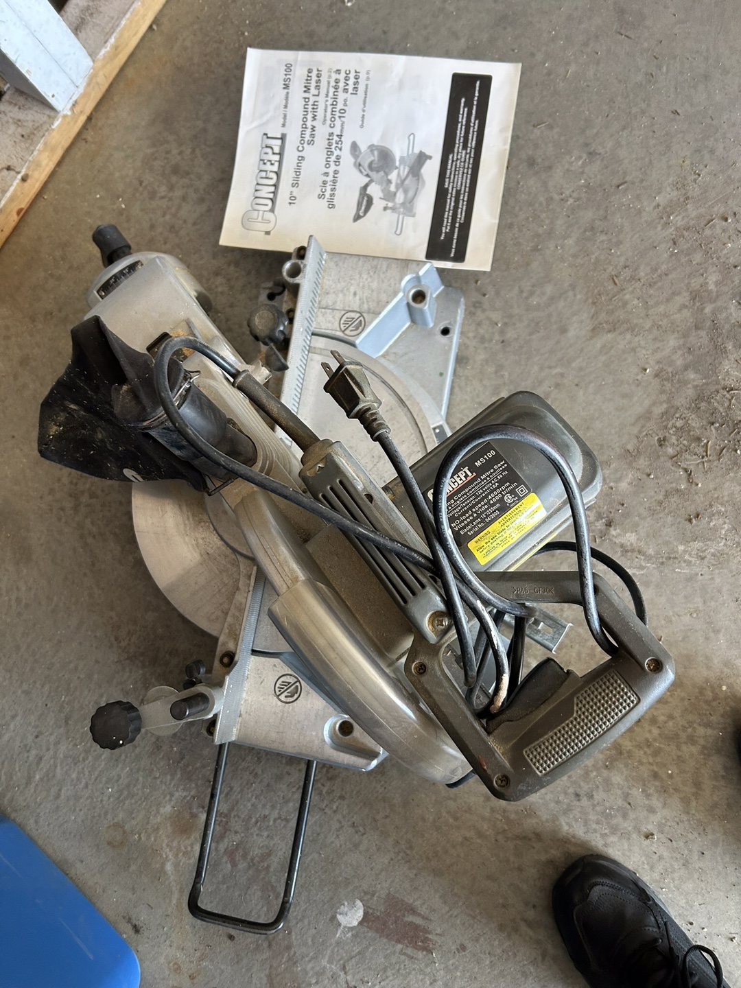 Selling a Concept MS100 10" Sliding Compound Mitre Saw with Laser. The operator's manual is included. The serial number is 04/2005.
