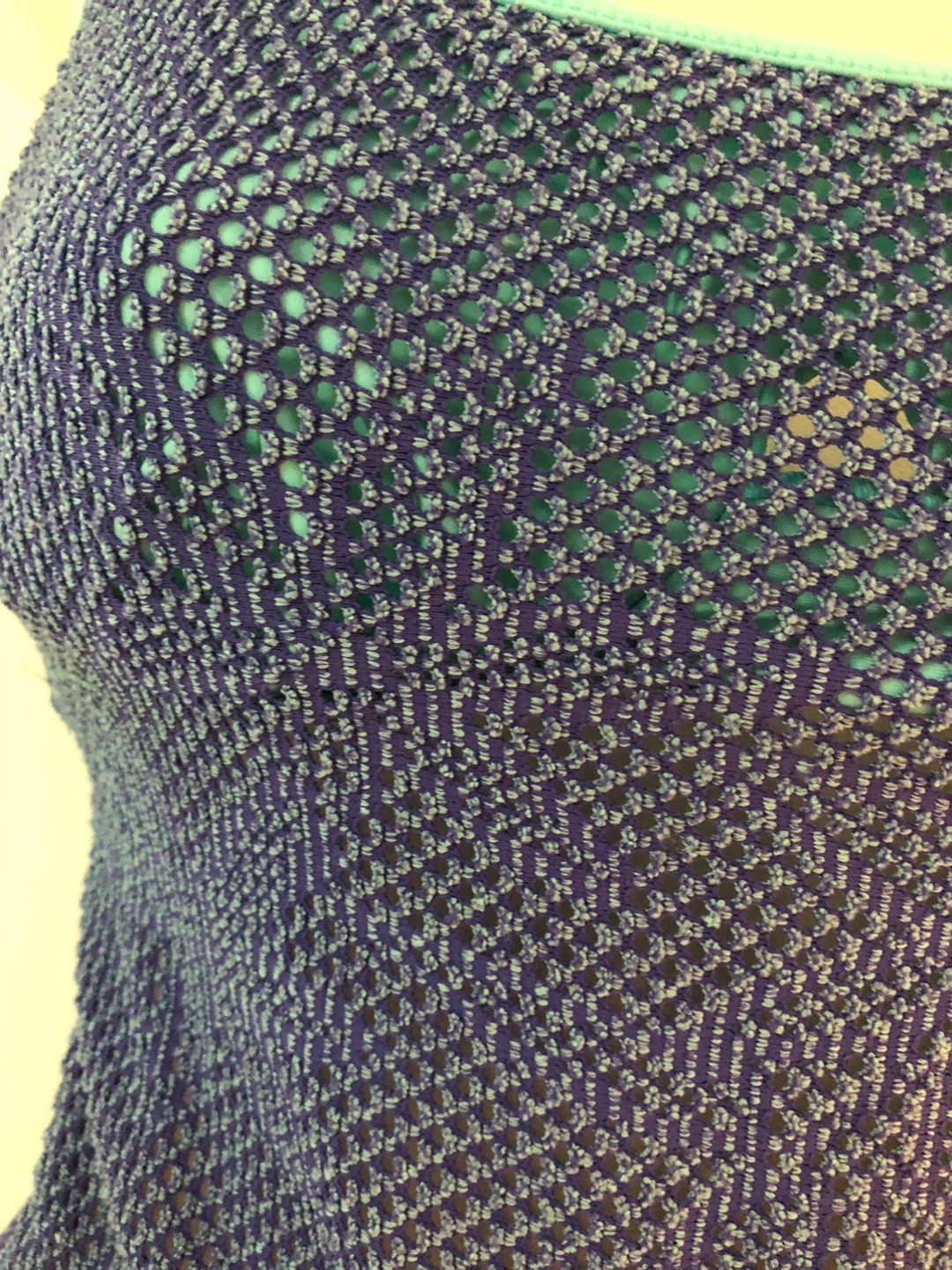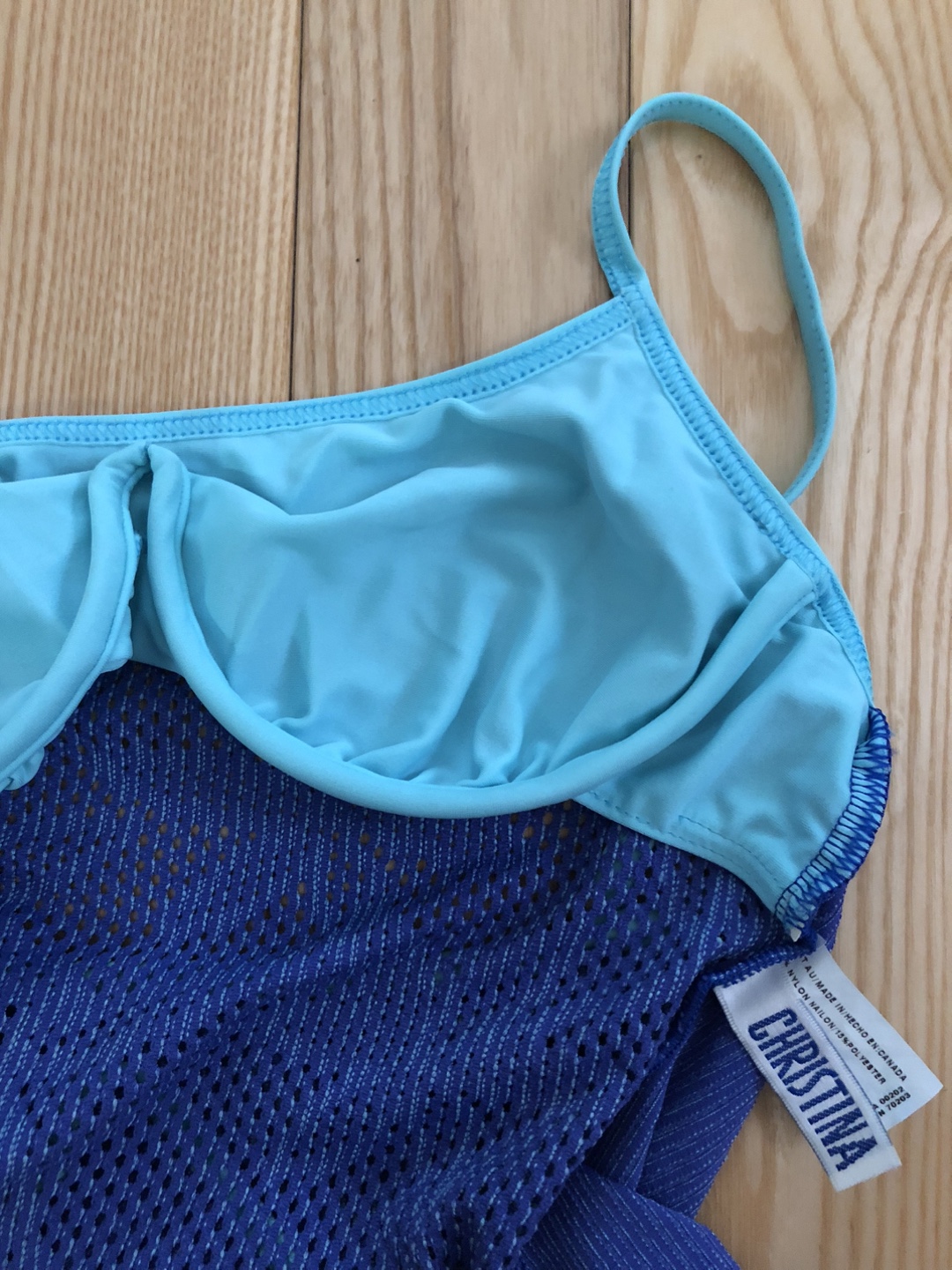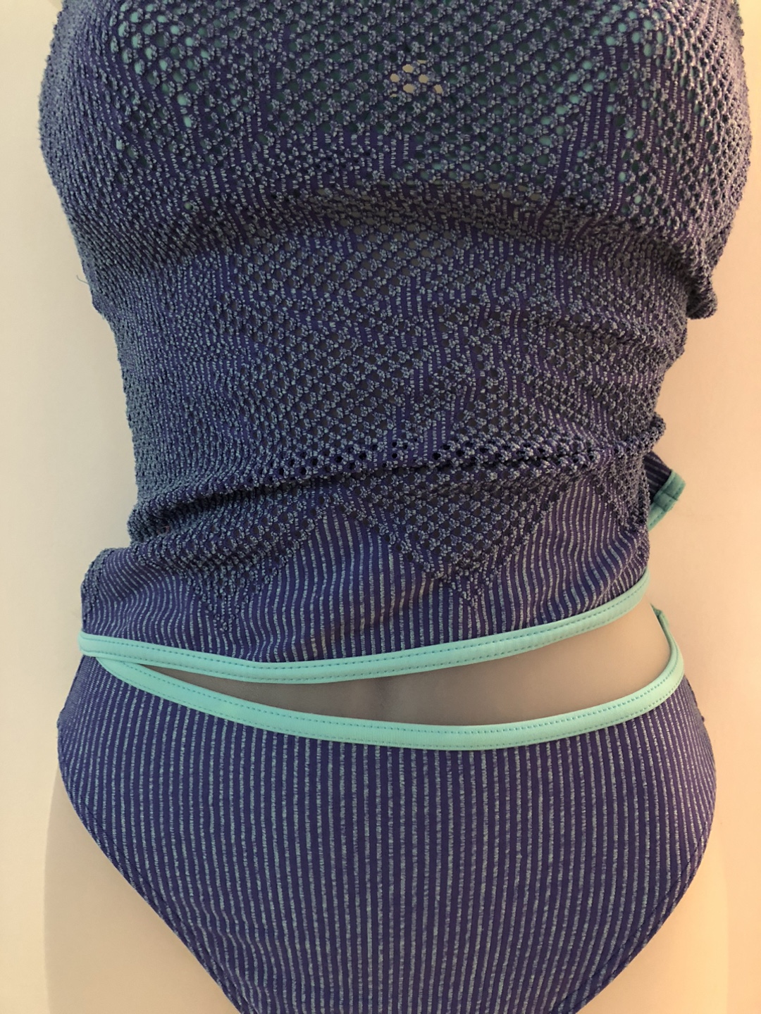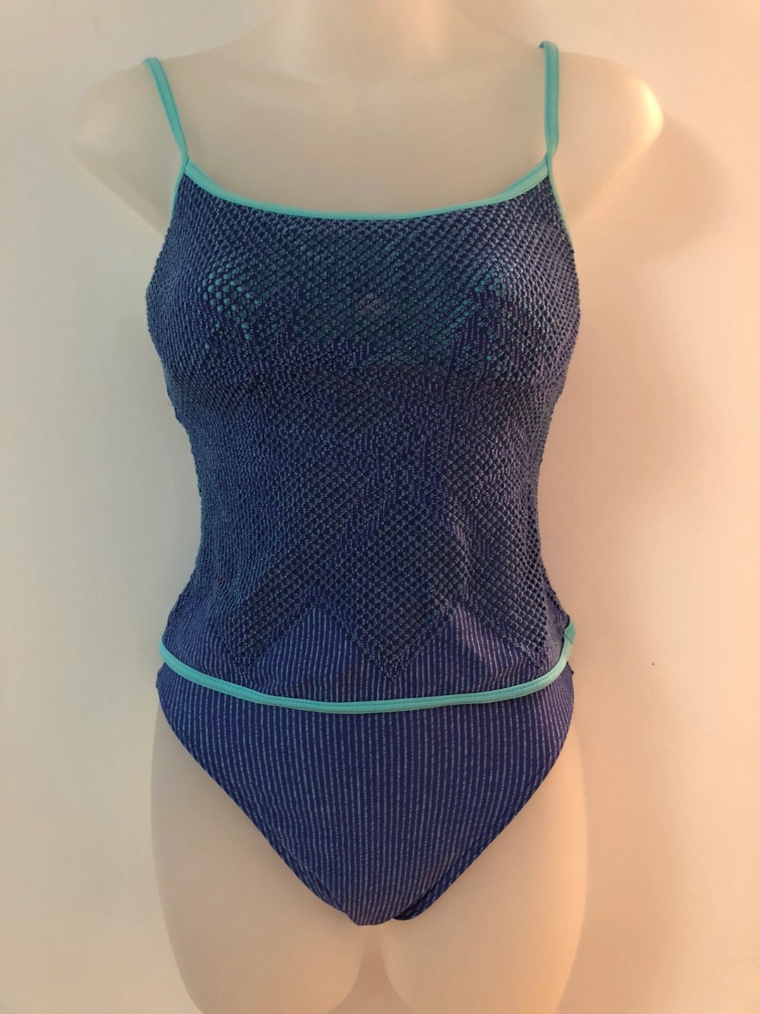 This is a Christina brand swimsuit in blue. It features a unique mesh design and a light blue trim.