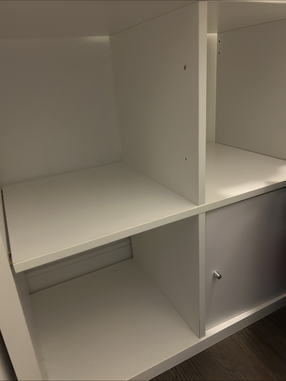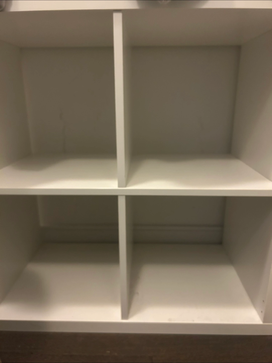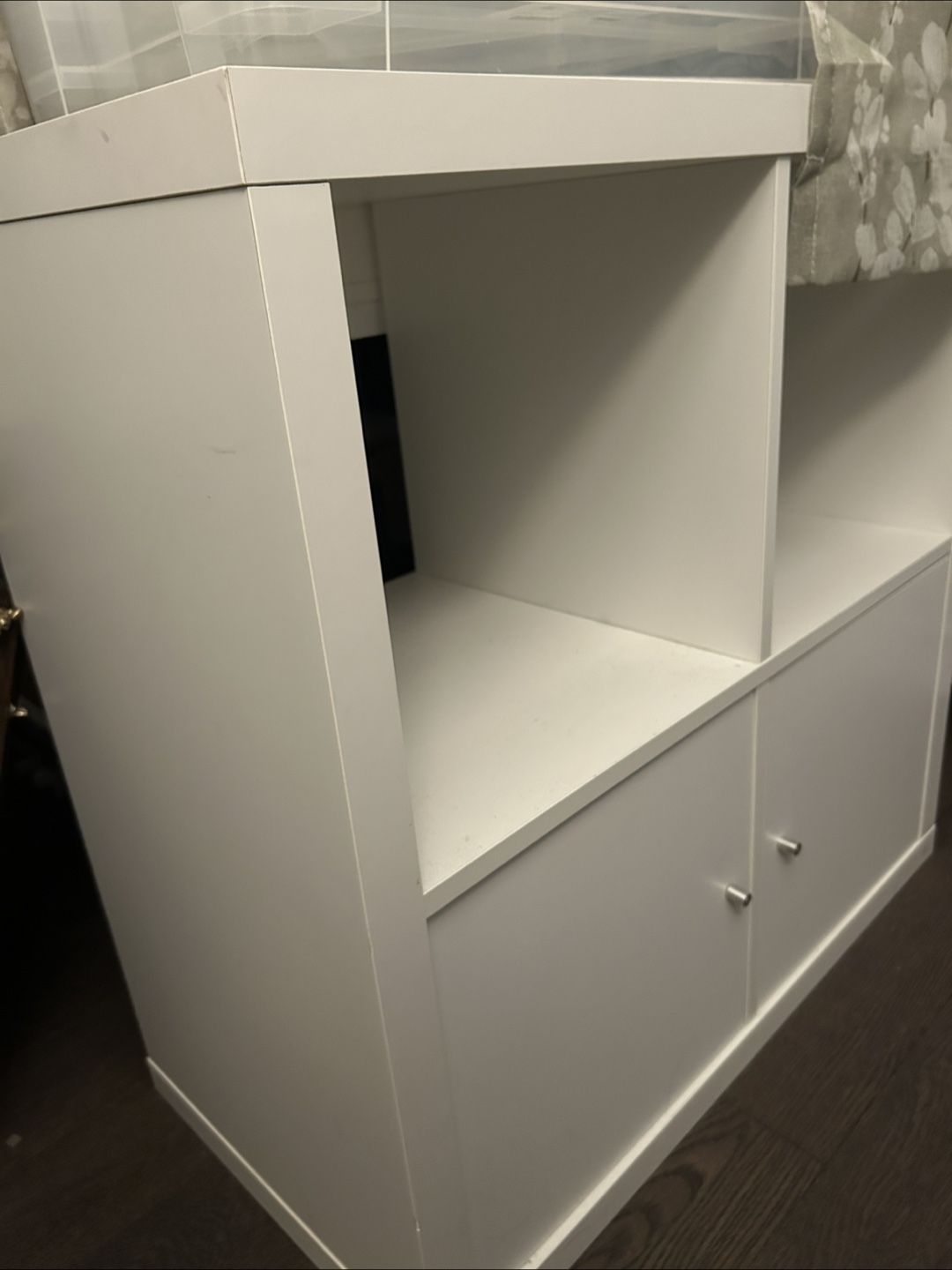 Selling a white cube storage unit, perfect for organizing any room in your home. It has a clean and simple design that fits well with any decor. It's in good condition and ready for a new home!