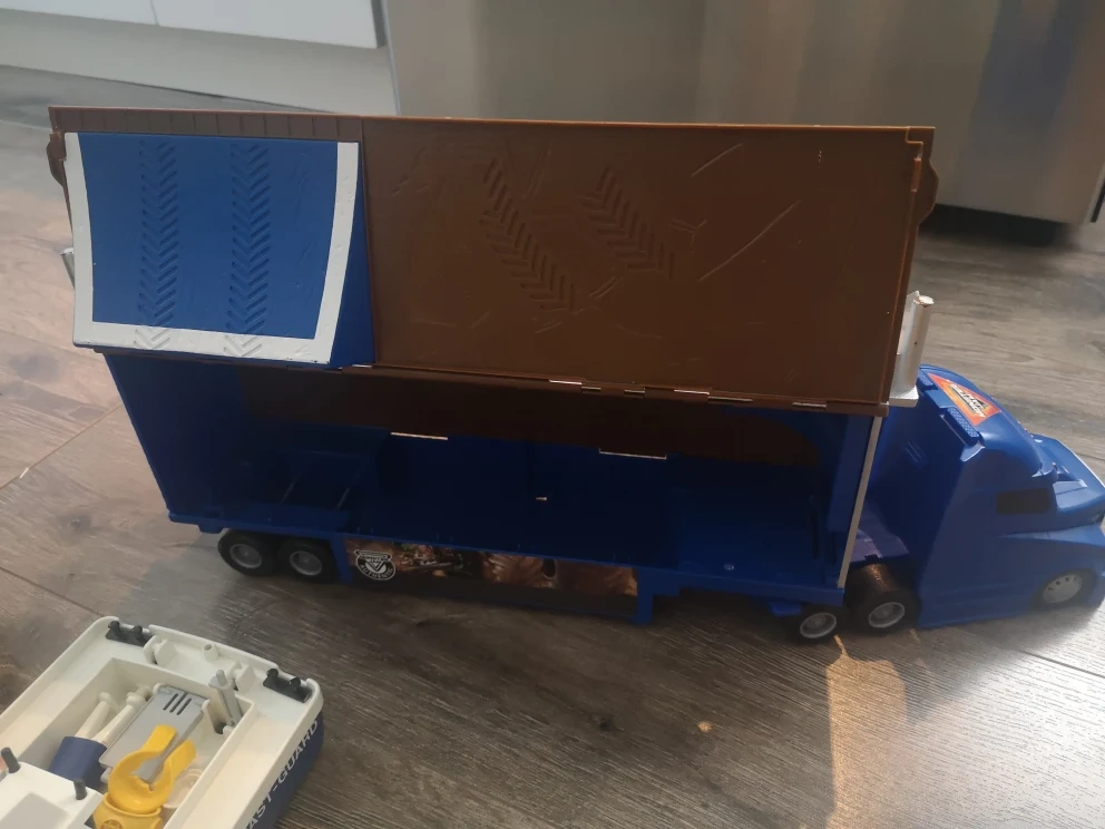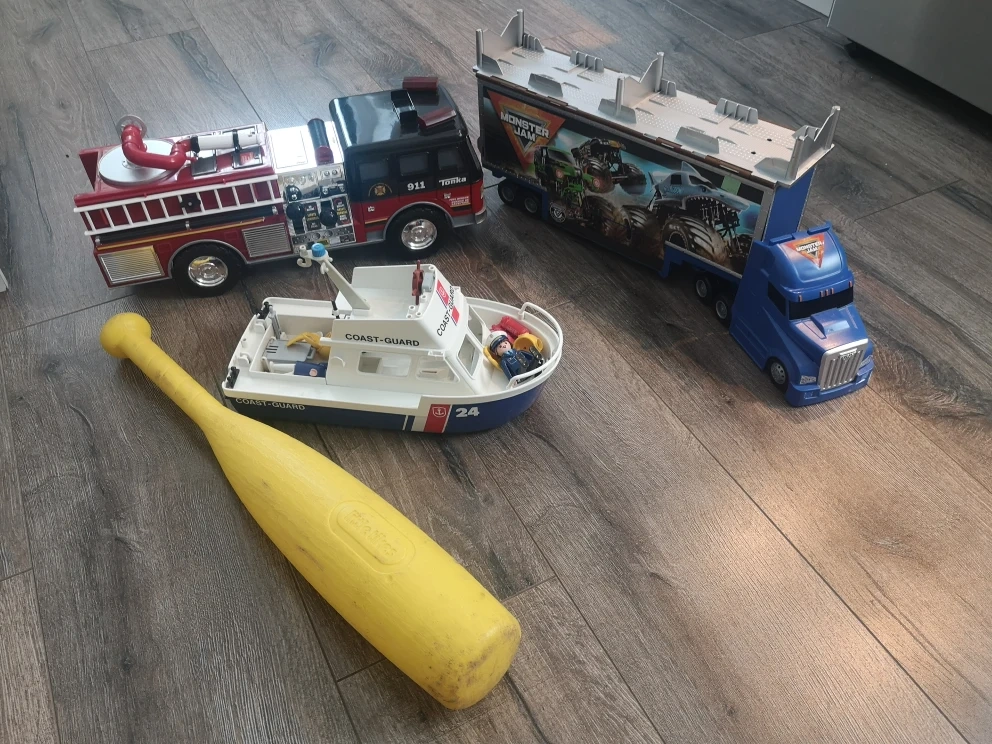 Selling a collection of toys. There's a Tonka fire truck, a Coast Guard boat, and a Monster Jam truck that opens up to store hot wheels. Plastic baseball bat. All in good condition for playtime fun!