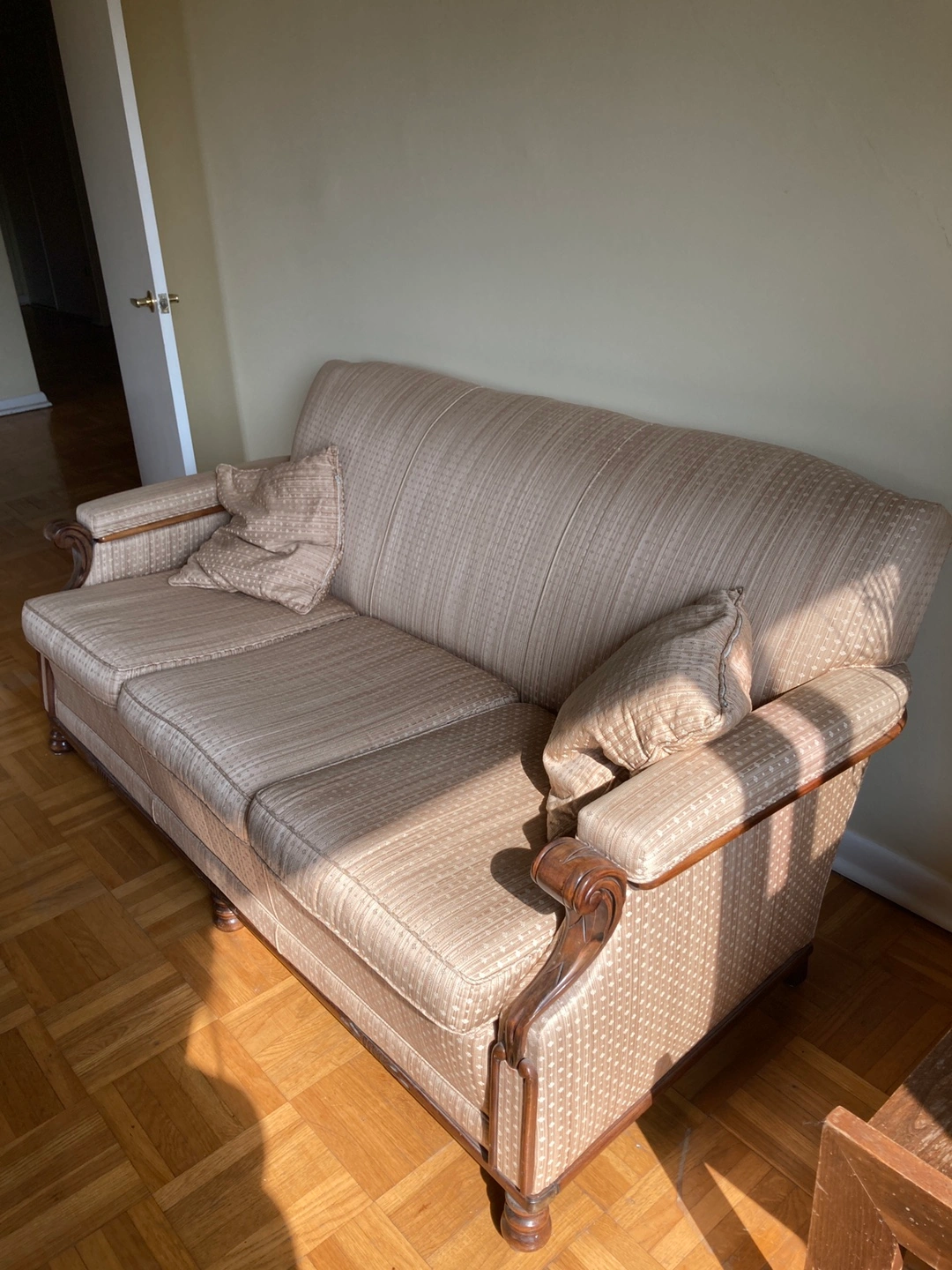 FREE! A lovely vintage-style sofa and matching armchair. They have a classic design with patterned upholstery and wooden armrests. Perfect for adding a touch of elegance to your living room or can be used as a stage prop etc. The couch does need some work on the bottom, but in overall in very good condition.