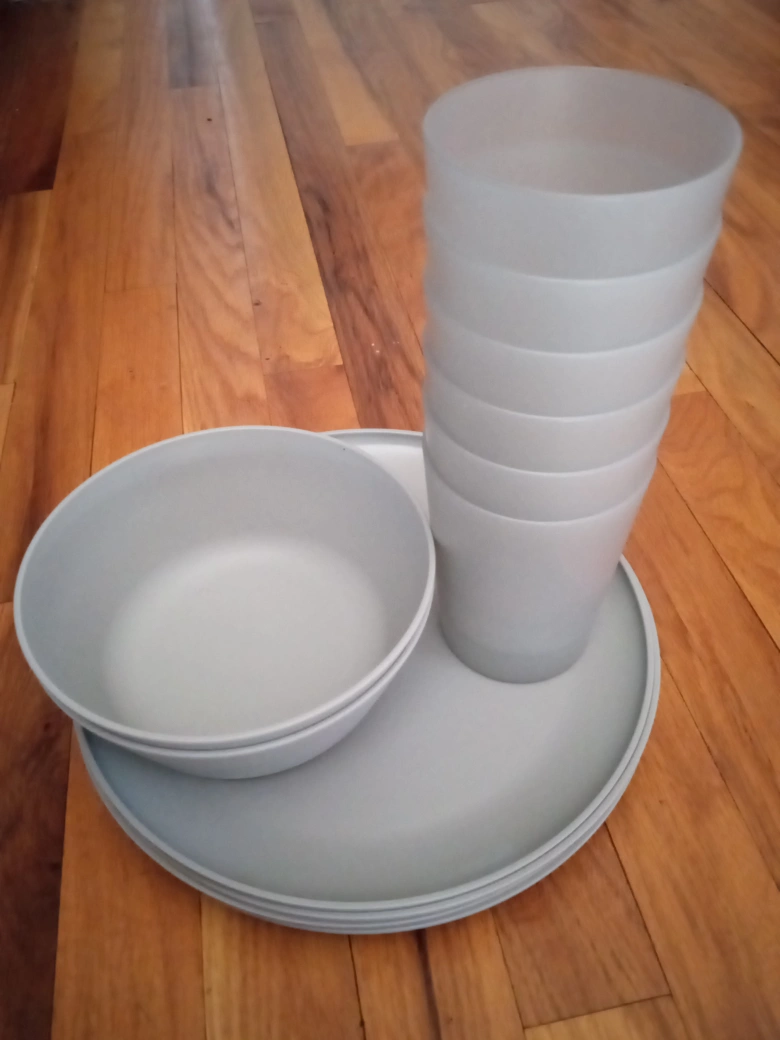 Giving away a light gray plastic dinnerware set. Includes plates, bowls, and cups. Great for everyday use or outdoor dining! They are in good condition.