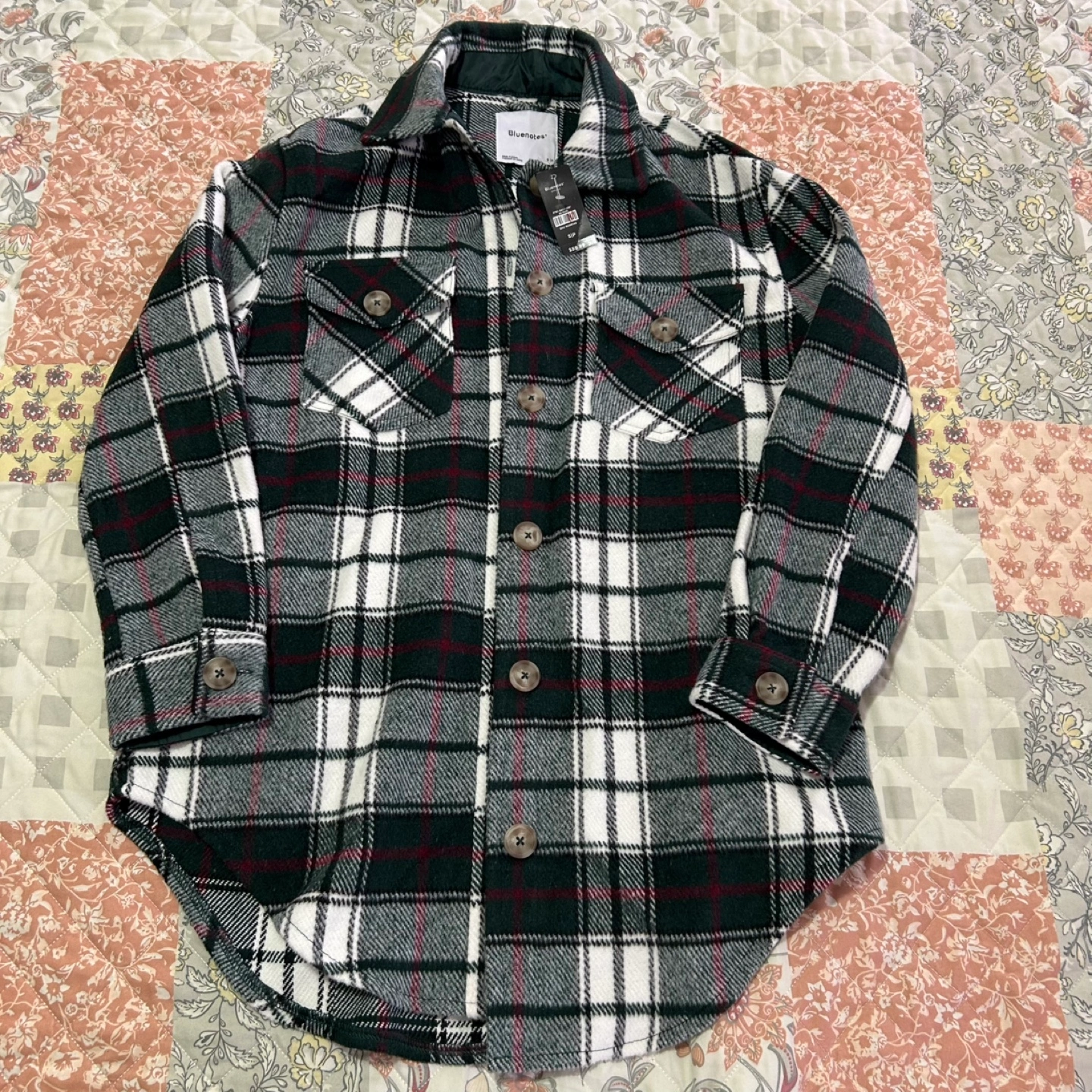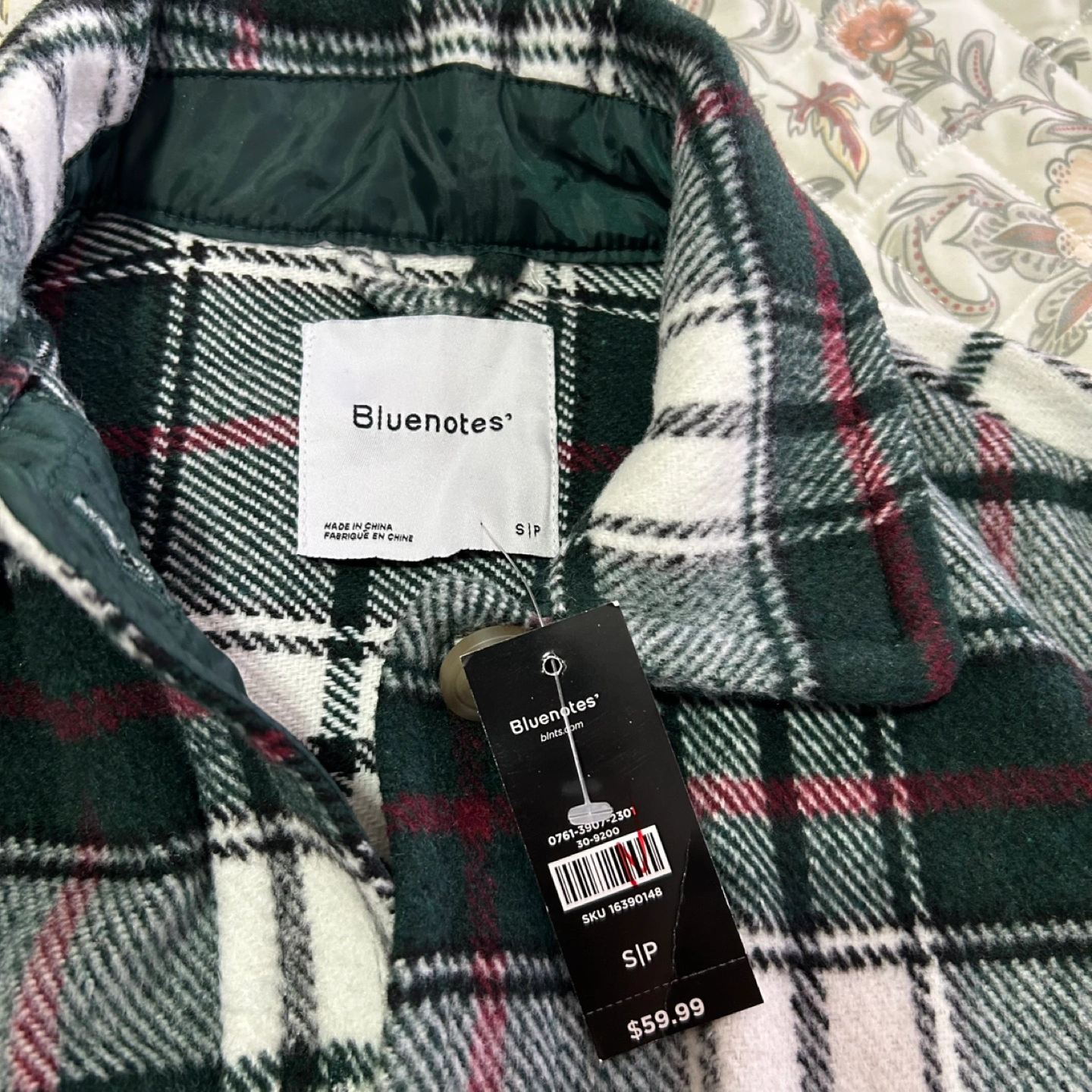 Selling a Bluenotes plaid shacket in size S/P. The shacket features a classic plaid pattern with a green and white color scheme. It's in great condition and originally bought for $59.99