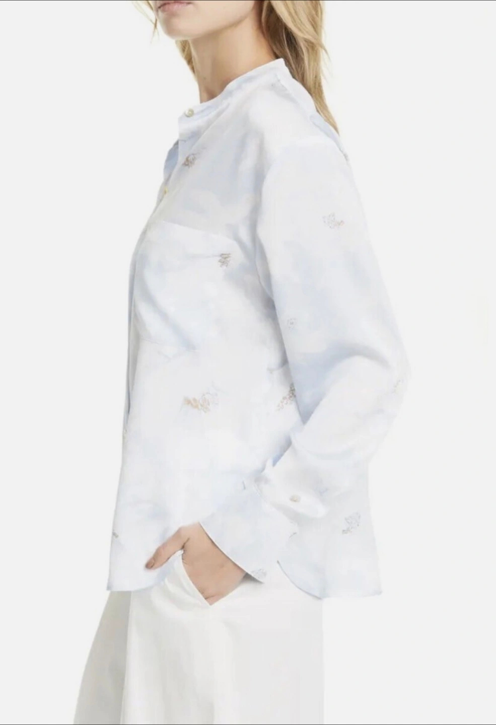 Light blue satiny blouse with paint-like white magnolia print by Vince. Luxury brand. Pit to pit 22” Model generated by ChatGPT for style inspiration only.