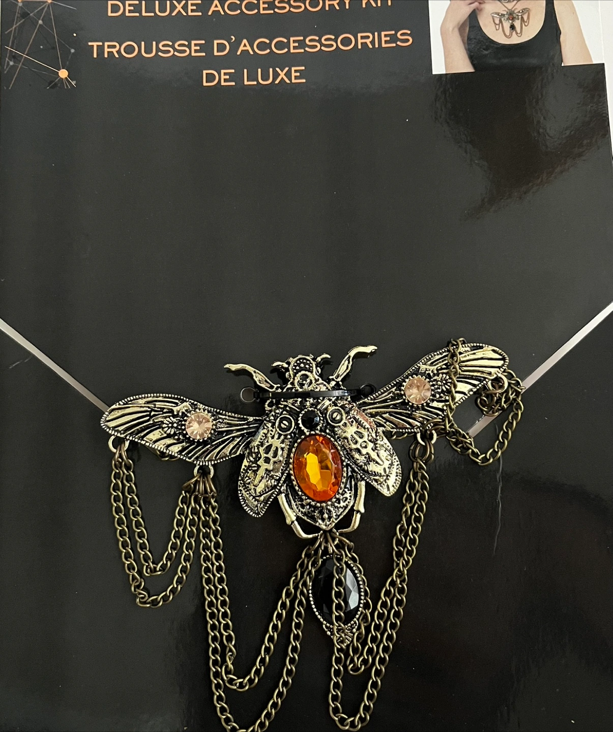 57Check out this deluxe accessory kit! It includes a beautiful bee necklace with intricate detailing and hanging chains. Perfect for adding a unique touch to any outfit