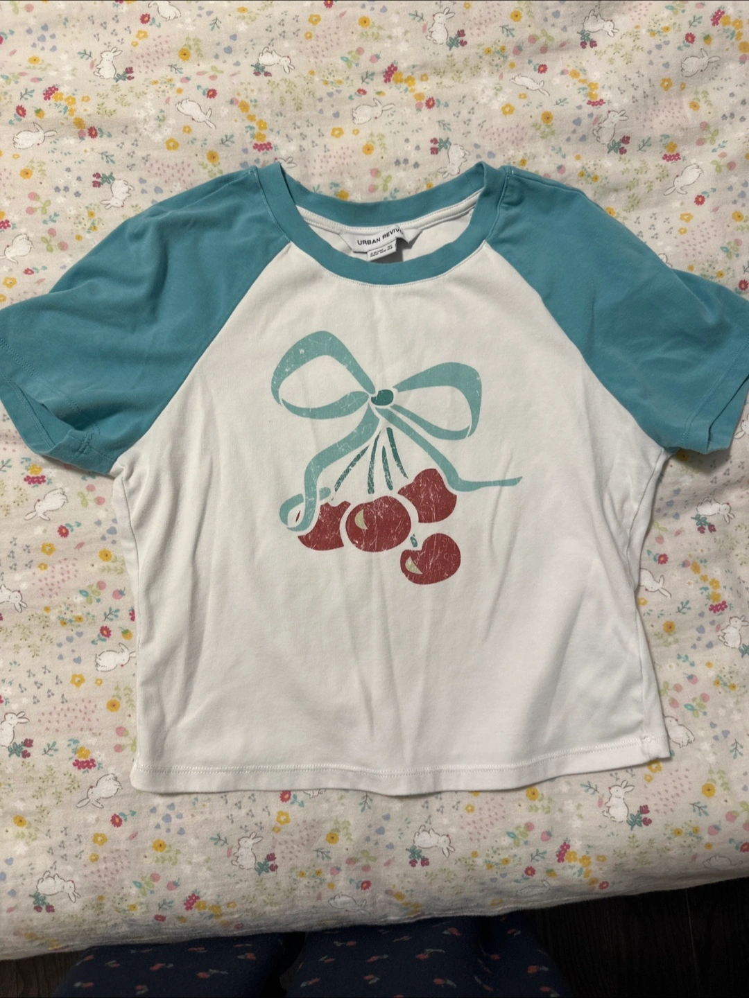 Cute Urban Revivo tee with a cherry print! It has light blue raglan sleeves and a white body. Great for a casual, fun look!