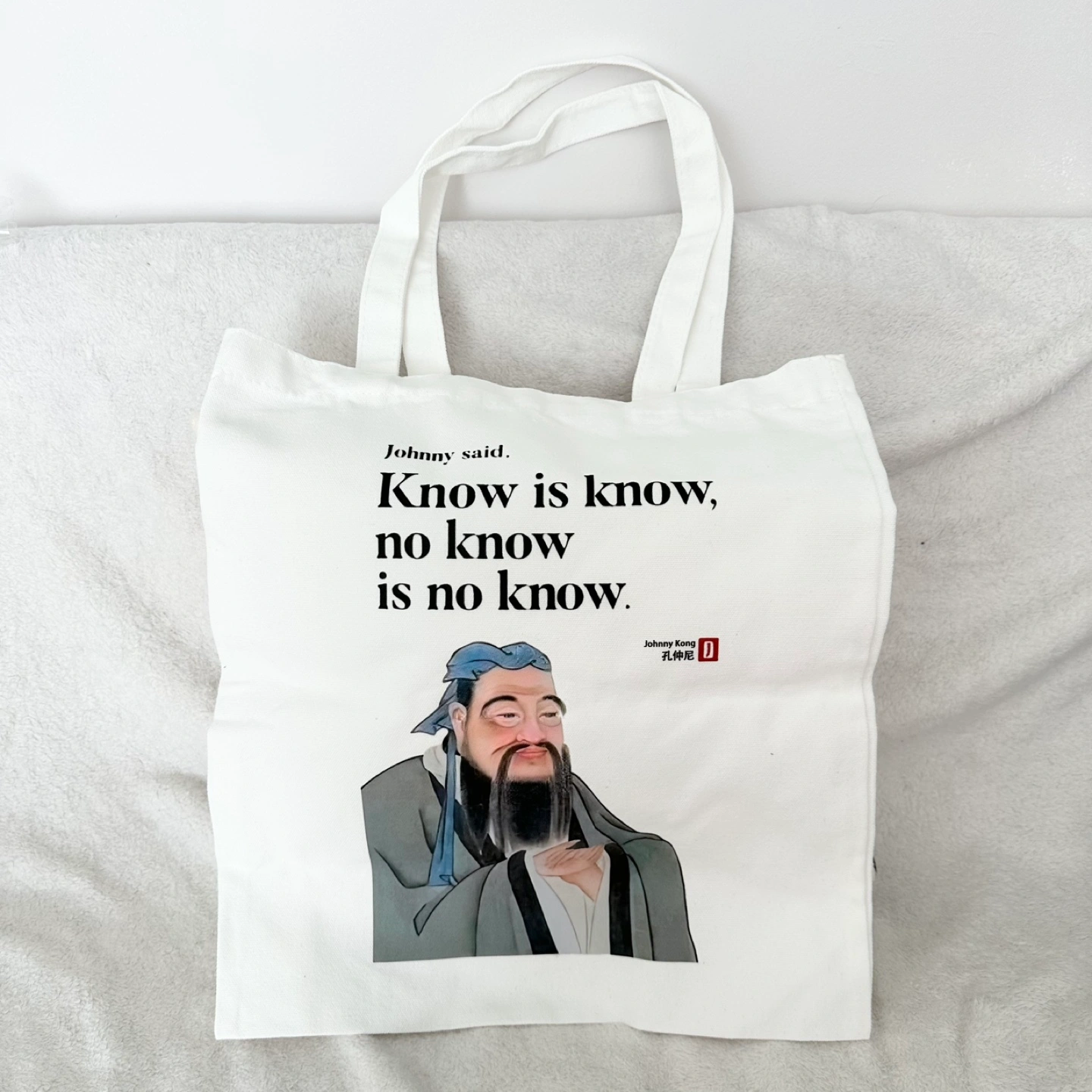 Here's a funny meme tote bag featuring the quote "Know is know, no know is no know" and an image of Johnny Kong.
