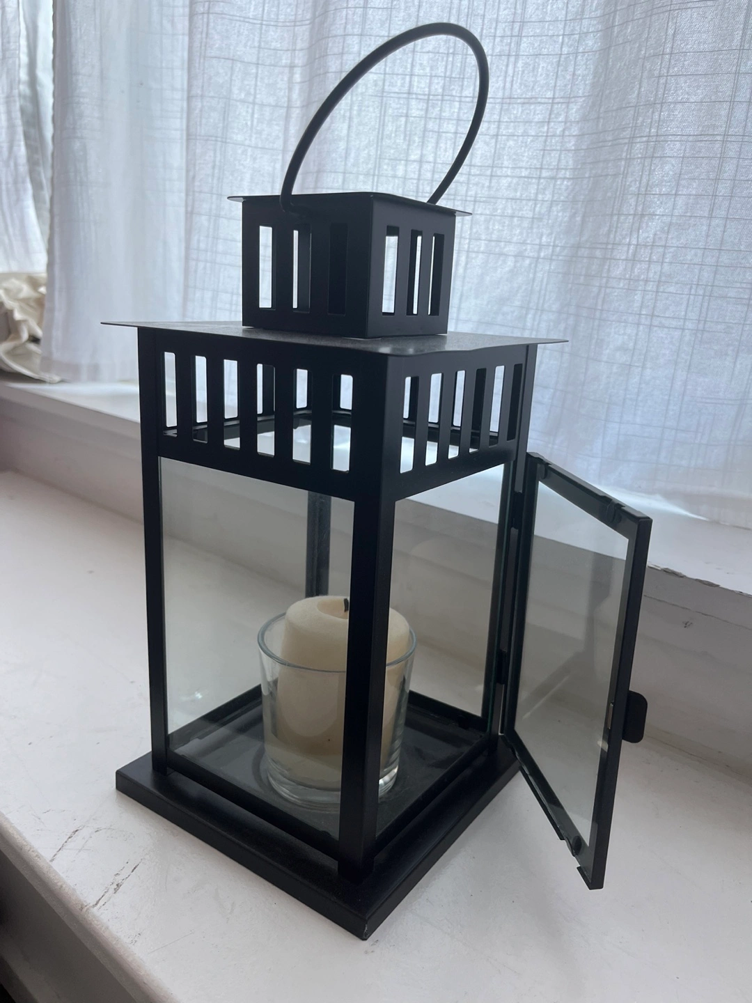 Selling a lovely black metal candle lantern! It's in great shape and perfect for adding a cozy touch to any room.