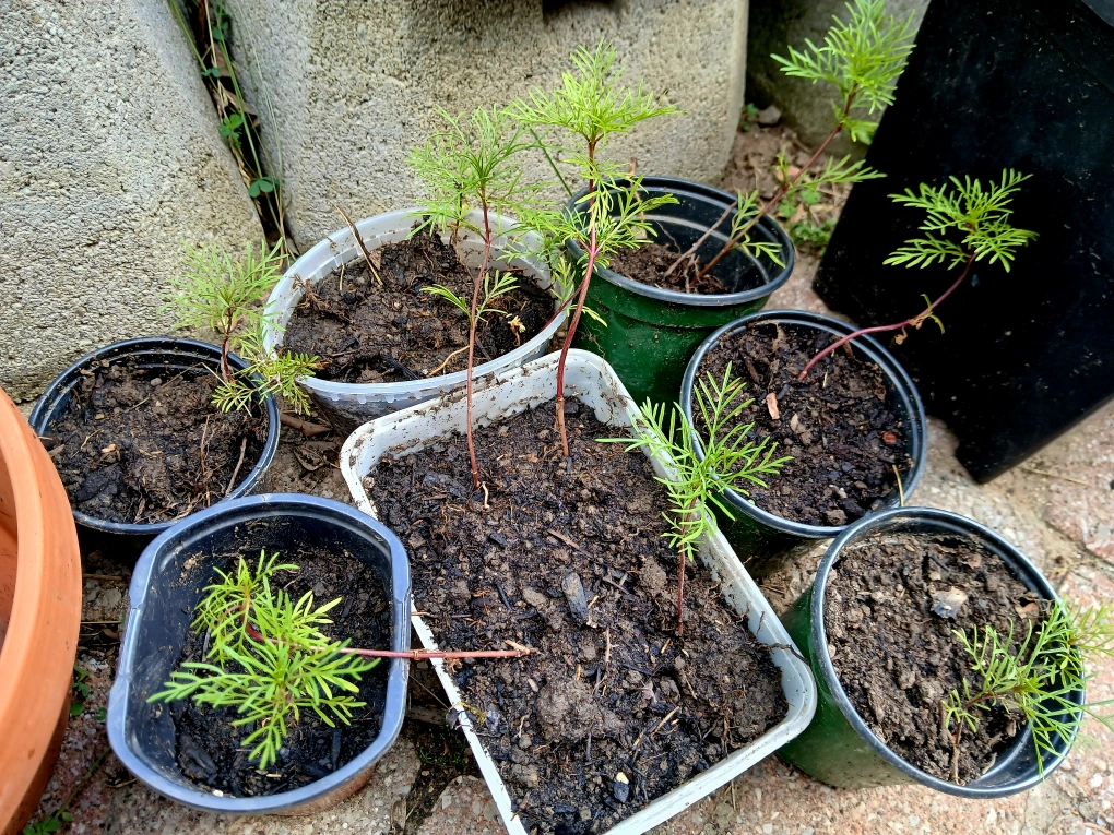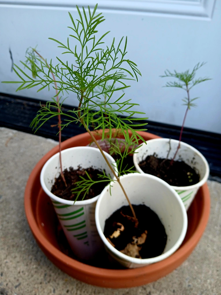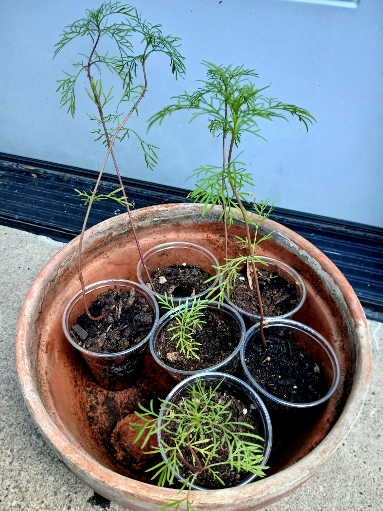 I have some lovely cosmos seedlings ready to find a new home in your garden! They're currently in small pots and are just waiting to be planted. The last photo shows the parent plant from last year so you can see what the flowers will look like. Get ready for some beautiful blooms!