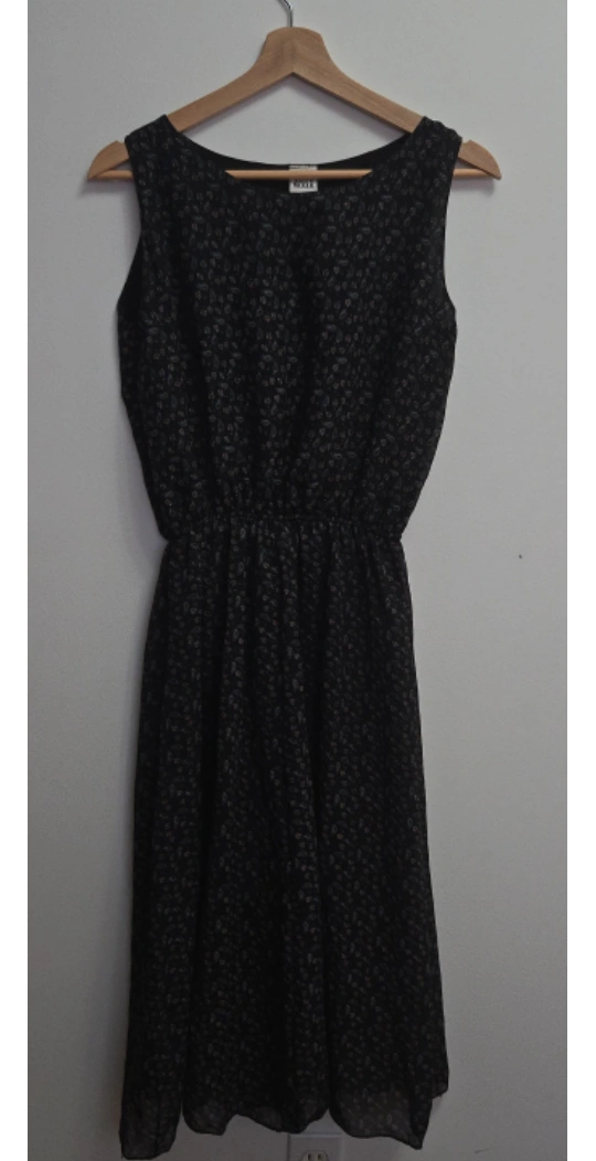 Selling a black sleeveless dress with a floral pattern. It's in great condition and perfect for a casual day out or a summer evening! The dress has a comfortable elastic waist too.